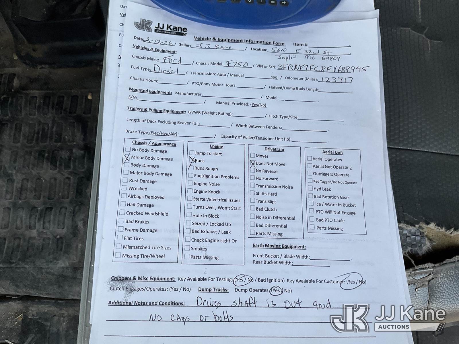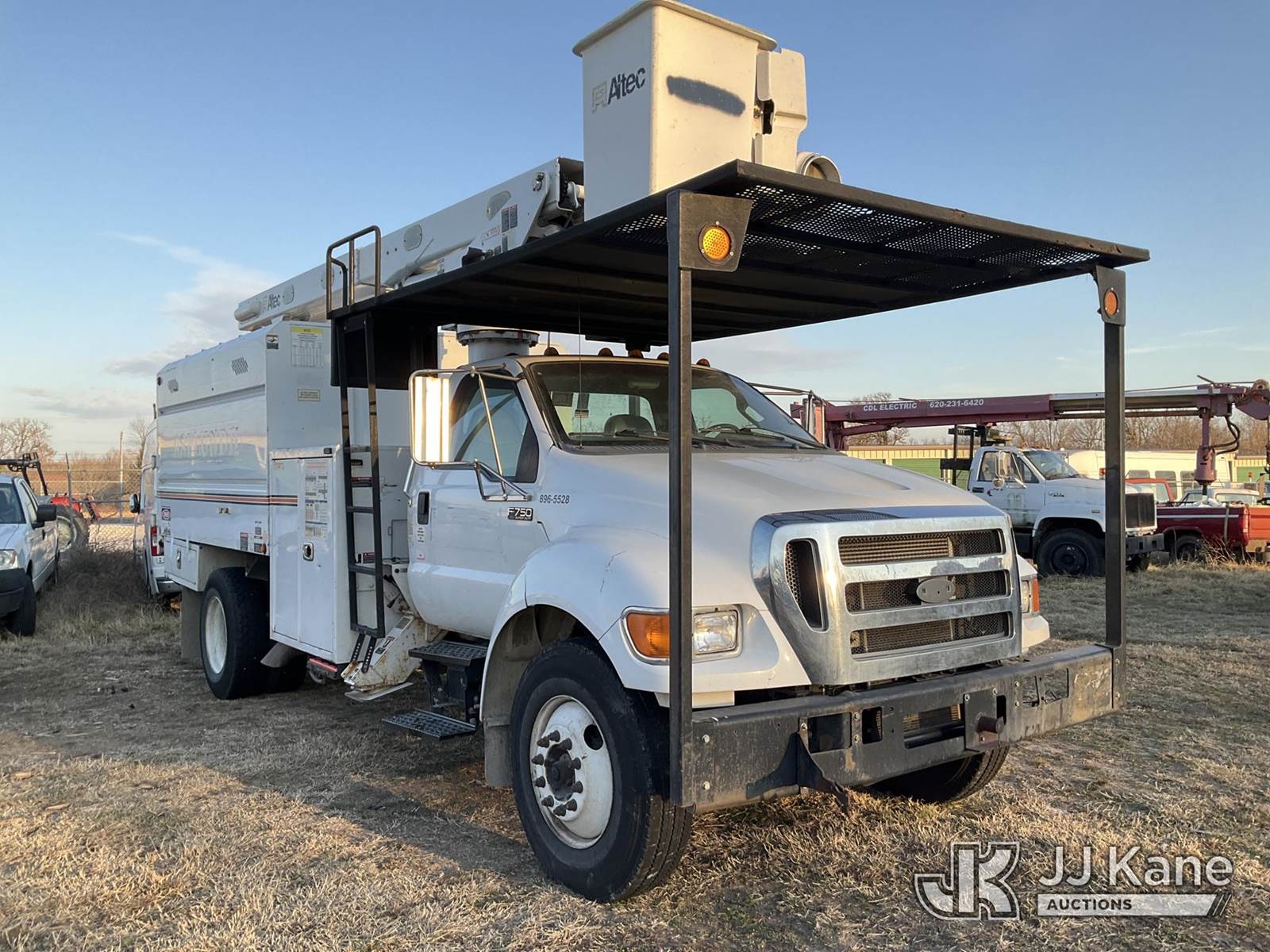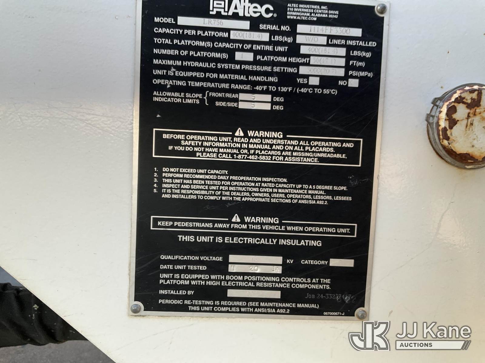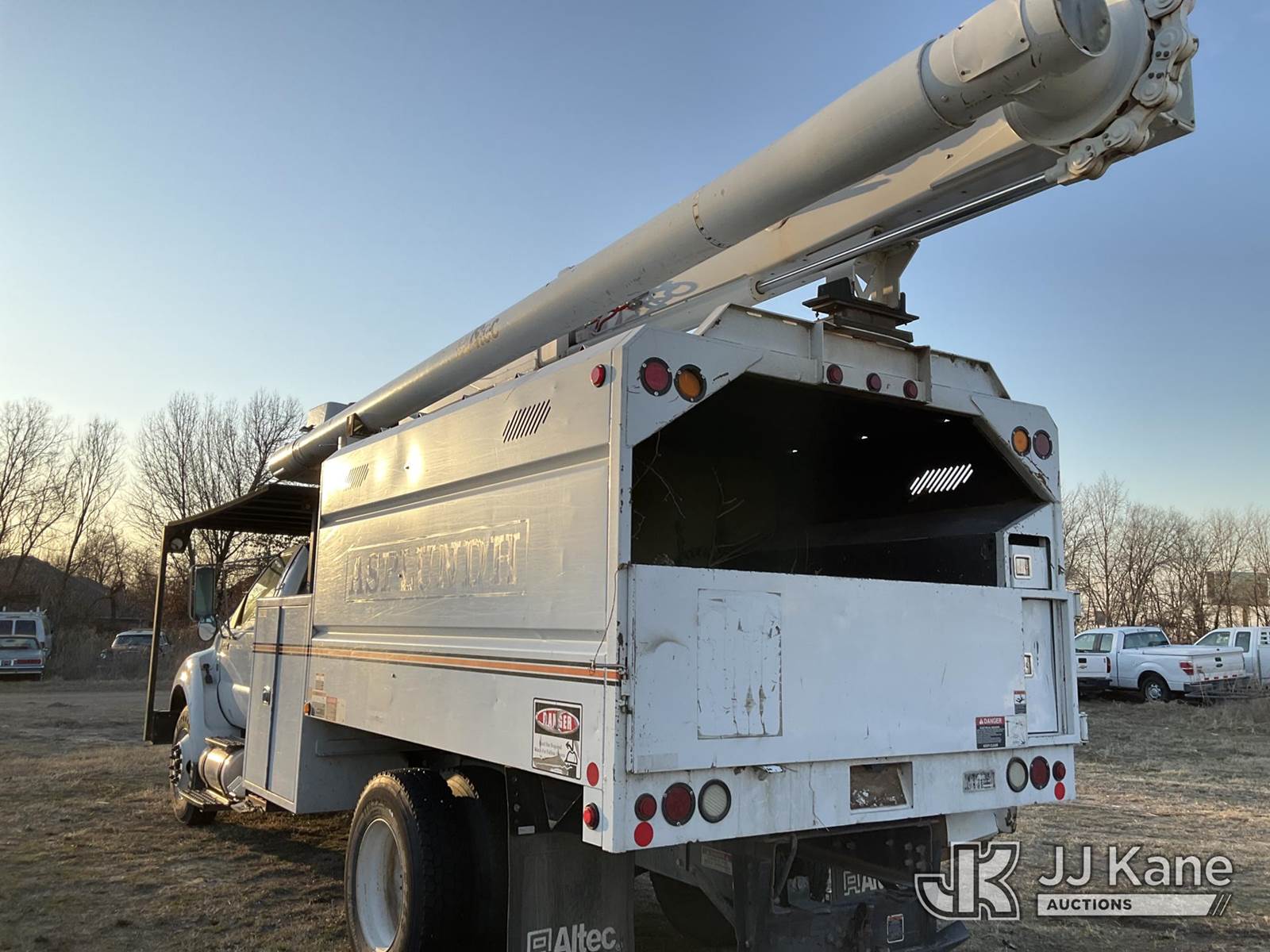 Altec LR756, 61 ft, Over-Center Bucket Truck s/n 1114FF3300, with single-man bucket & 2 hyd outriggers, rear mounted on 2015 Ford F-750 Chipper Dump Truck, 6.7L L6 DIESEL 4X2, 6-spd, A/C, (123,717 miles) (Runs, Moves & Upper Operates) (Multiple Dash Lights On, Check Engine Light On The manufacturer has notified JJ Kane that this equipment is subject to an open recall. CSN 672 LRV/LR7 Leveling Yoke Inspection The equipment should not be operated until this is addressed. Buyer is responsible for reviewing the recall notice and contacting the manufacturer to schedule the recommended corrective actions. Associated costs may be covered by the manufacturer in some cases.) This is a Titled Item NOTE: This unit is being sold AS IS/WHERE IS via Timed Auction and is located in Joplin, MO. Inspection & preview days for this unit are by appointment only; please contact us at contact@jjkane.com or 84-Go-JJKane for more details. (Missing manuals, See Auction Company for Manufacturers Information to obtain manuals) (Buyer is responsible for removal. Assistance by consignor or JJ Kane Auctions is not assured.)