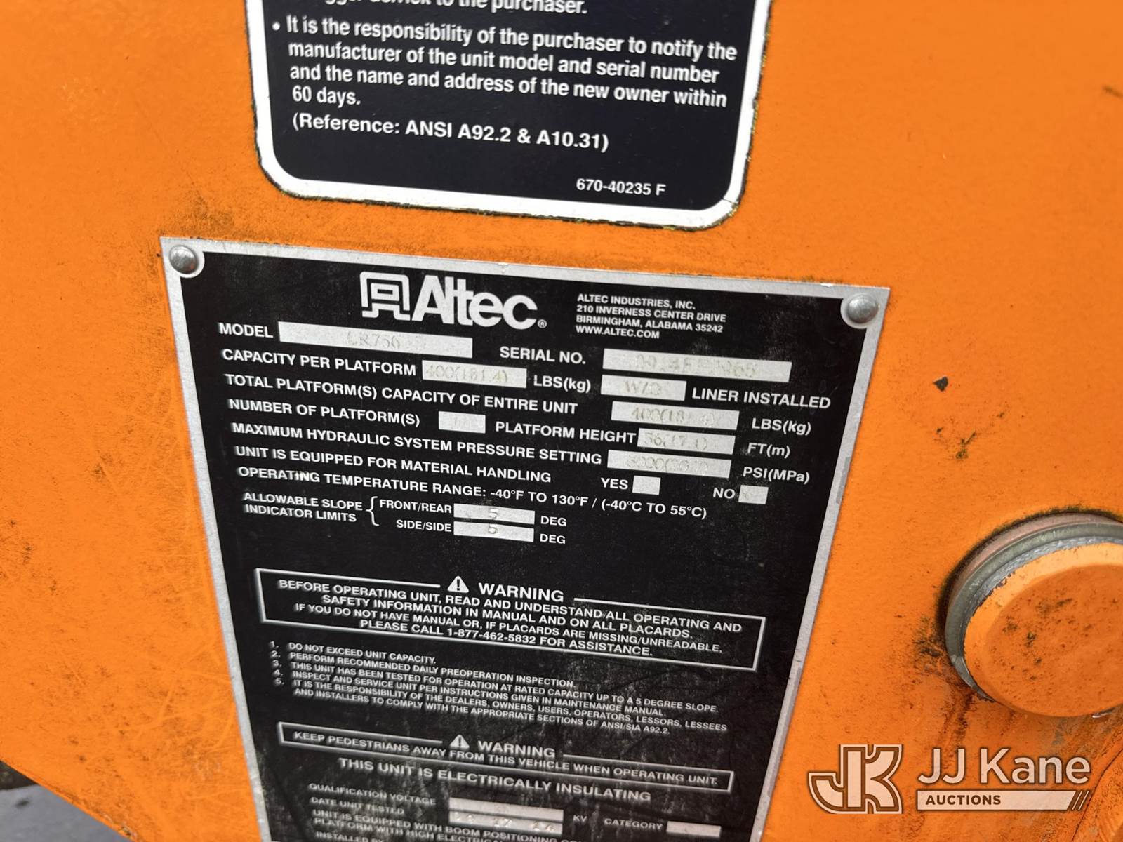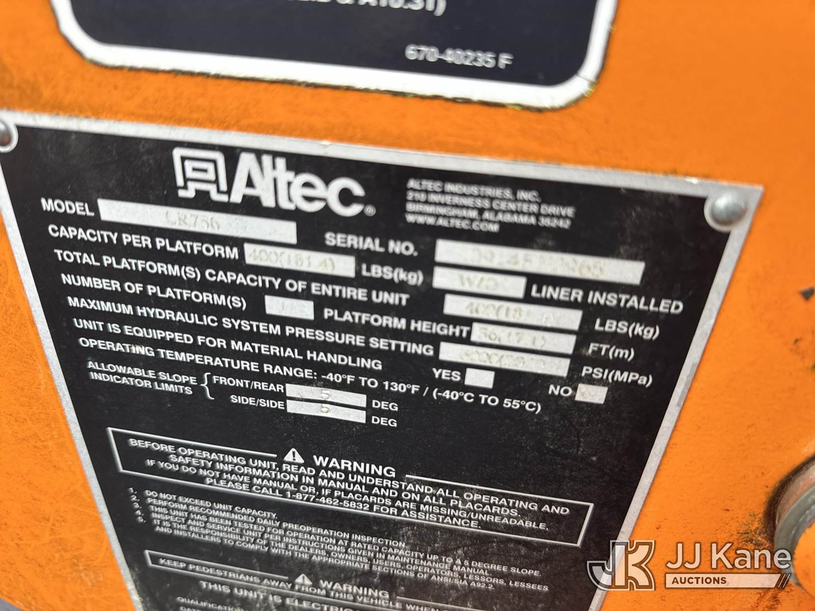 Altec LR756, 61 ft, Over-Center Bucket Truck s/n 0914FF2965, with single-man bucket, mounted behind cab on 2015 Ford F750 Chipper Dump Truck, 6.7L diesel, 6-spd, (030,757 miles) PREVIOUS NO SALE: Should have been listed as red tag. PLEASE UPDATE CONDITIONS BEFORE ACTIVATING -MB (Runs, Moves & Upper Operates) (Check Engine Light On, Missing Grille) (Red Tagged: Customer stated that truck operator drove into tree and platform was hit causing leveling chain to jump timing on the leveling sprocket. Unit cannot be serviced until customer provides paperwork certifying the repair by a 3rd party or Altec Service have completed a MUD on the unit) (The manufacturer has notified JJ Kane that this equipment is subject to an open recall. CSN 672 LRV/LR7 Leveling Yoke Inspection The equipment should not be operated until this is addressed. Buyer is responsible for reviewing the recall notice and contacting the manufacturer to schedule the recommended corrective actions. Associated costs may be covered by the manufacturer in some cases.) This is a Titled Item NOTE: This unit is being sold AS IS/WHERE IS via Timed Auction and is located in Chester, VA. Inspection & preview days for this unit are the 2 business days prior to the first day of items closing for this auction, item is located at 1840 Battery Dantzler Ct. Chester, VA 23836 and hours of operations are 7am-3pm. For pre-sale questions, please contact Doug Caton @ 804-807-4574. (Manuals provided in cab) (Buyer is responsible for removal. Assistance by consignor or JJ Kane Auctions is not assured.)