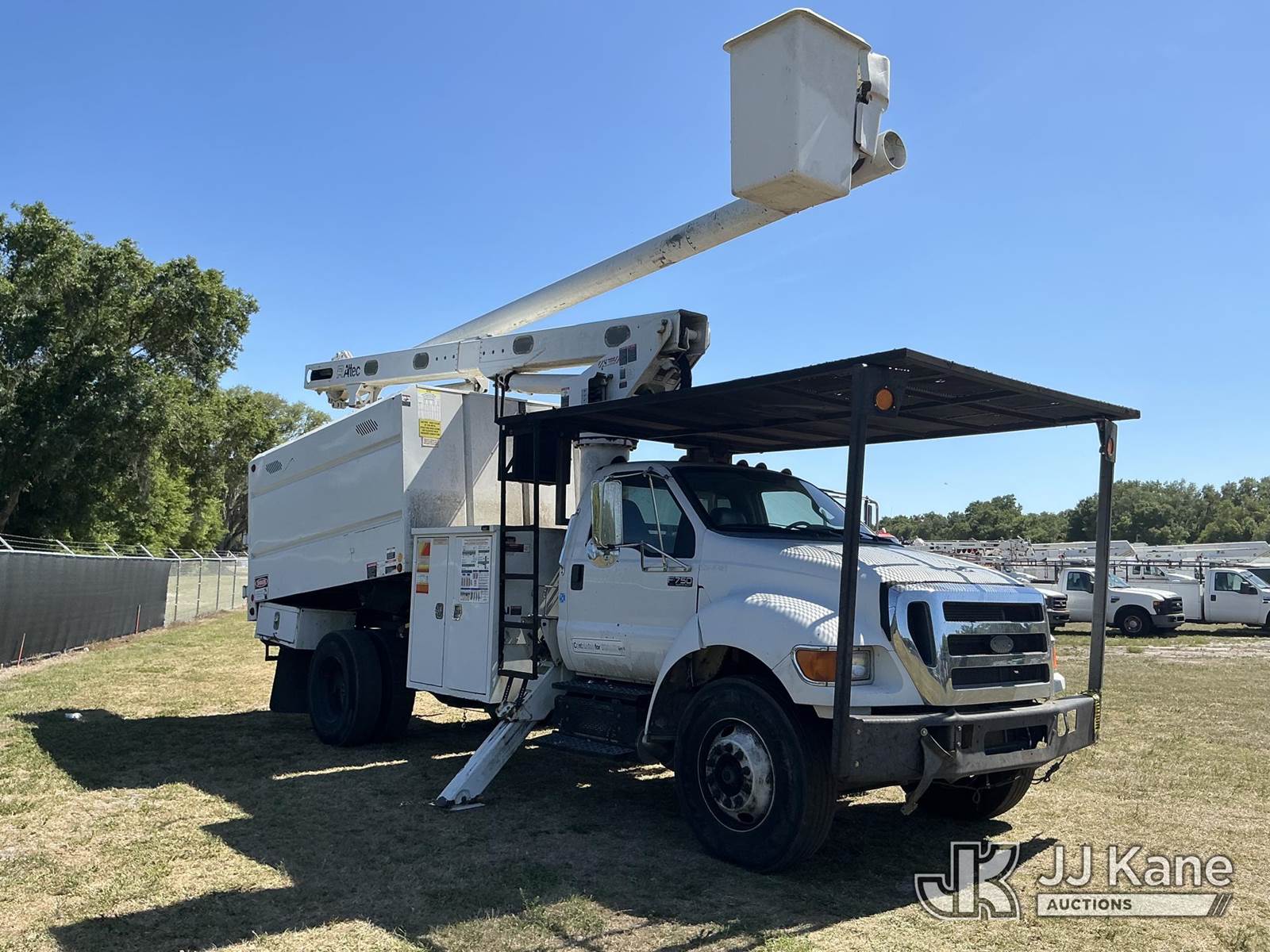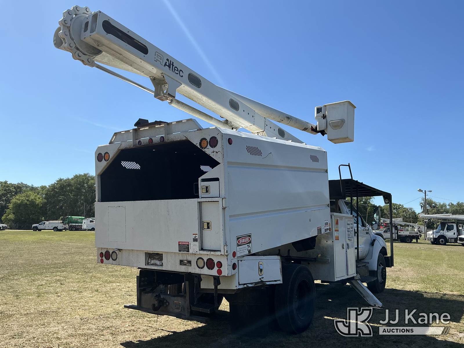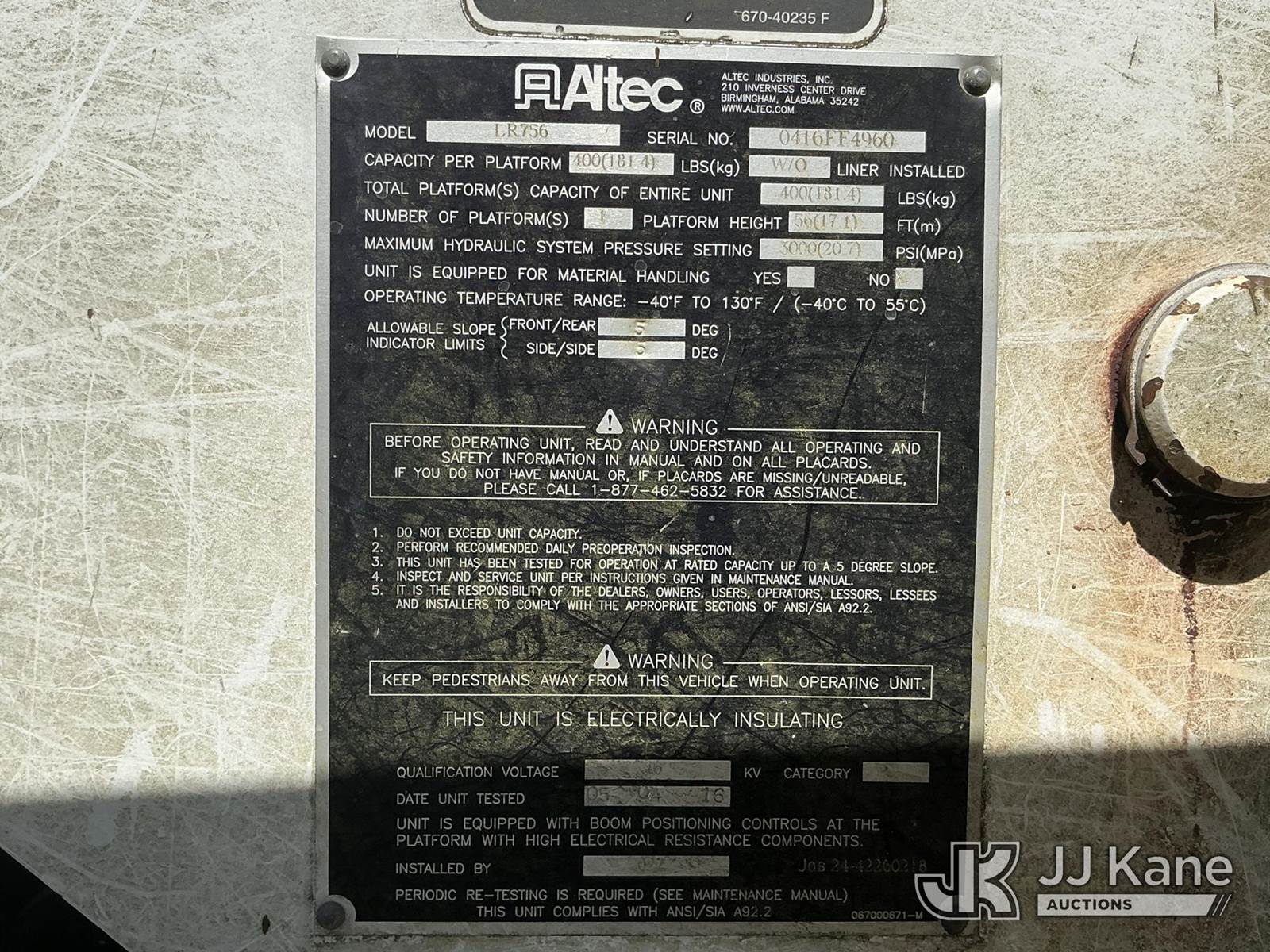Altec LR756, 61 ft, Over-Center Bucket Truck s/n 0416FF4960, with single-man bucket & 2 hydraulic outriggers, mounted behind cab on 2015 Ford F-750 Chipper Dump Truck, 6.7L Diesel, 4X2, 6-spd, A/C, (78,200 miles) (Runs, Moves, Upper Operates) (Jump To Start, Engine Lights On) (FL Residents Purchasing Titled Items – tax, title & registration fees will be collected at the maximum rate of $400.00 under 25,999 and $800.00 for Over 26,000 and $250.00 trailers – Proof of insurance is mandatory; Out of State Residents Purchasing Title Items – tax will be collected based upon your state rate.) This is a Titled Item NOTE: This unit is being sold AS IS/WHERE IS via Timed Auction and is located in Thonotosassa, FL. Inspection & preview days for this unit are the 2 business days prior to the first day of items closing for this auction, item is located at 11720 N US 301 Thonotosassa, Fl 33592 and hours of operations are 8a-4p. For pre-sale questions, please contact Office Staff @ (813) 986-2485. (Missing manuals, See Auction Company for Manufacturers Information to obtain manuals) (Buyer is responsible for removal. Assistance by consignor or JJ Kane Auctions is not assured.)
