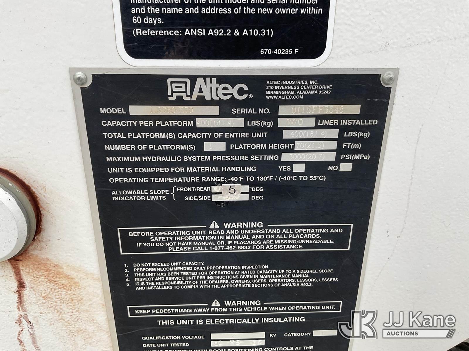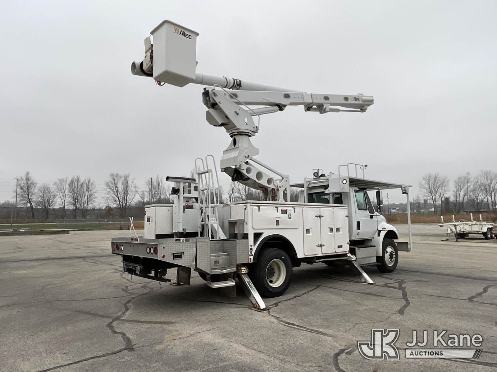 Altec LR760-E70, 75 ft, Over-Center Elevator Bucket Truck s/n 0115FF3548, with single-man bucket, four hyd. outriggers, rear mounted on 2015 International DuraStar 4300 Utility Truck, 5.9L diesel Auto, 4X2, A/C, (72,127 miles) Owned and maintained since new by Indiana REMC. Stored inside since new. (Runs, Moves, & Upper Operates) (Body Damage) (Reads 8,336 hours) This is a Titled Item NOTE: This unit is being sold AS IS/WHERE IS via Timed Auction and is located in Lagrange, IN. Inspection & preview days for this unit are by appointment only; please contact us at contact@jjkane.com or 84-Go-JJKane for more details. (Missing manuals, See Auction Company for Manufacturers Information to obtain manuals) (Buyer is responsible for removal. Assistance by consignor or JJ Kane Auctioneers is not assured.)