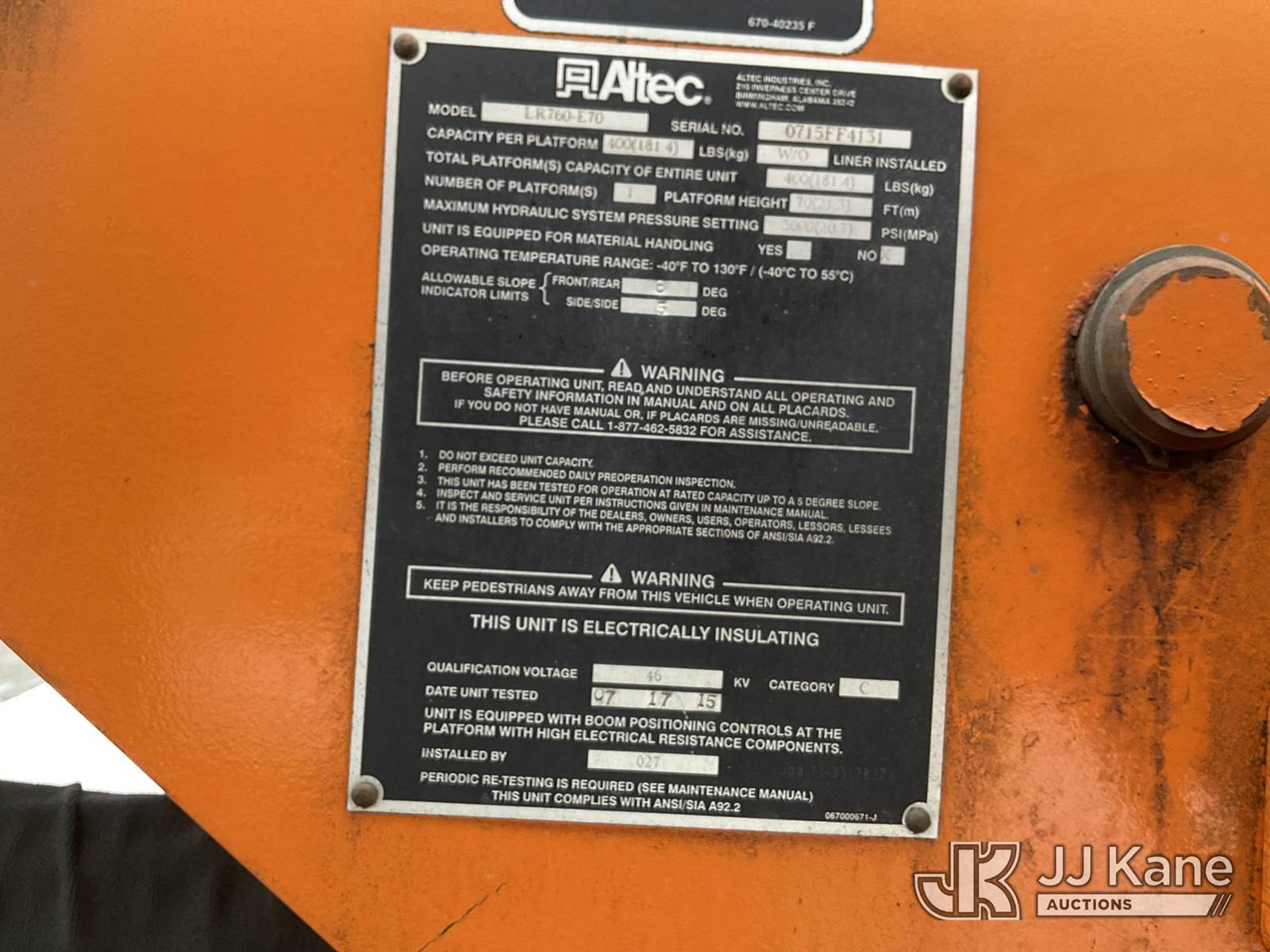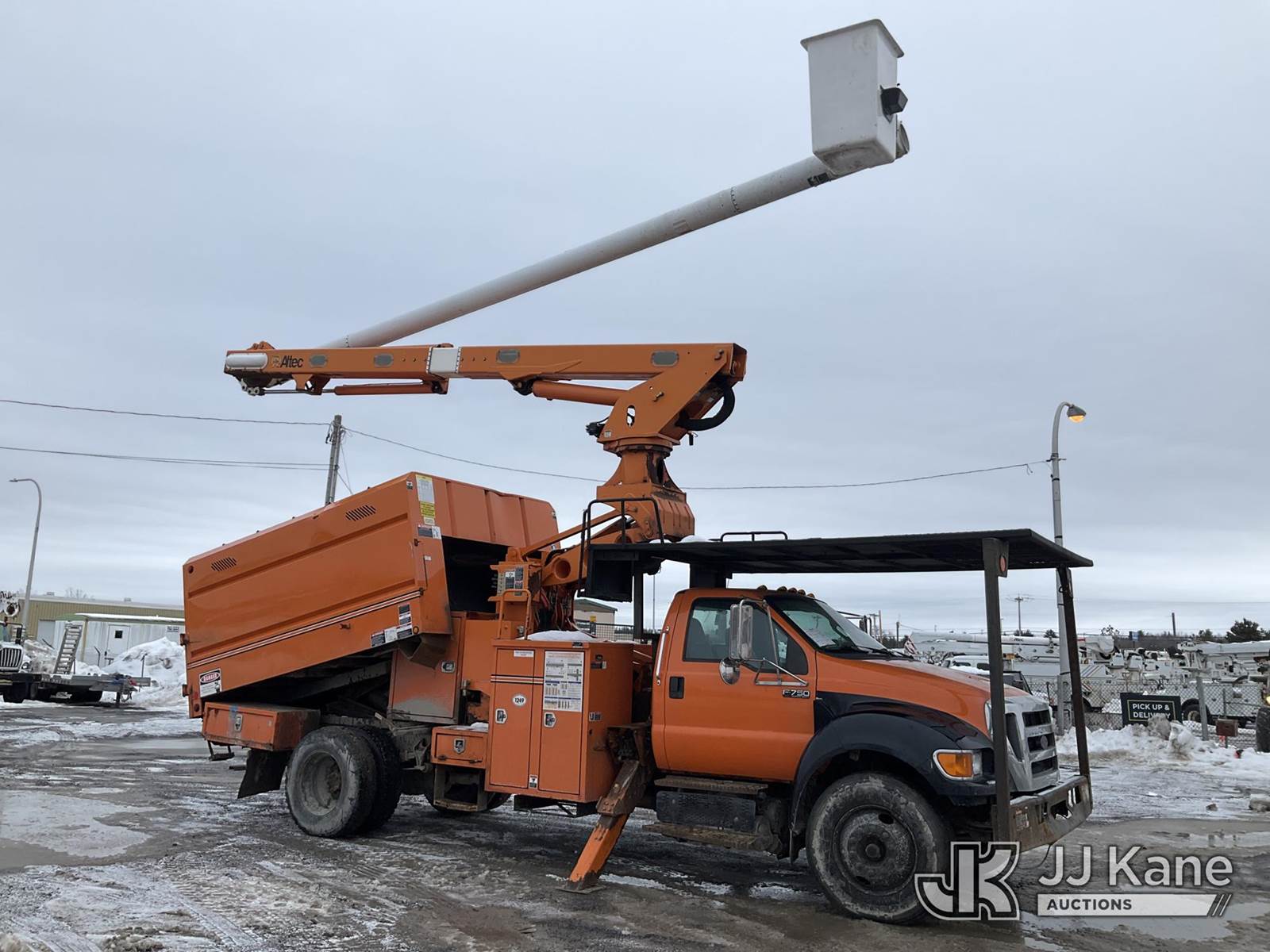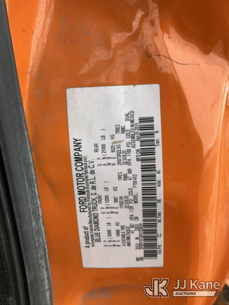 Altec LR760E70, 75 ft, Over-Center Elevator Bucket Truck s/n 0715FF4131, with Single Man Bucket & 2 Outriggers , mounted behind cab on 2015 Ford F750 Chipper Dump Truck, 6.7L diesel, 6-spd, with 11 ft body, (108,948 miles) (Seller States- Truck is Derated, Check Engine Light On, Runs, Moves & Upper Operates , Missing Upper Controls at Bucket) This is a Titled Item NOTE: This unit is being sold AS IS/WHERE IS via Timed Auction and is located in Rome, NY. Inspection & preview days for this unit are the 2 business days prior to the first day of items closing for this auction, item is located at 5835 Success Dr Rome, NY 13440 and hours of operations are 8a-4p. For pre-sale questions, please contact Ryan Jackson @ (315) 749-3790 or Ryan.Jackson@jjkane.com. (Missing manuals, See Auction Company for Manufacturers Information to obtain manuals) (Buyer is responsible for removal. Assistance by consignor or JJ Kane Auctions is not assured.)