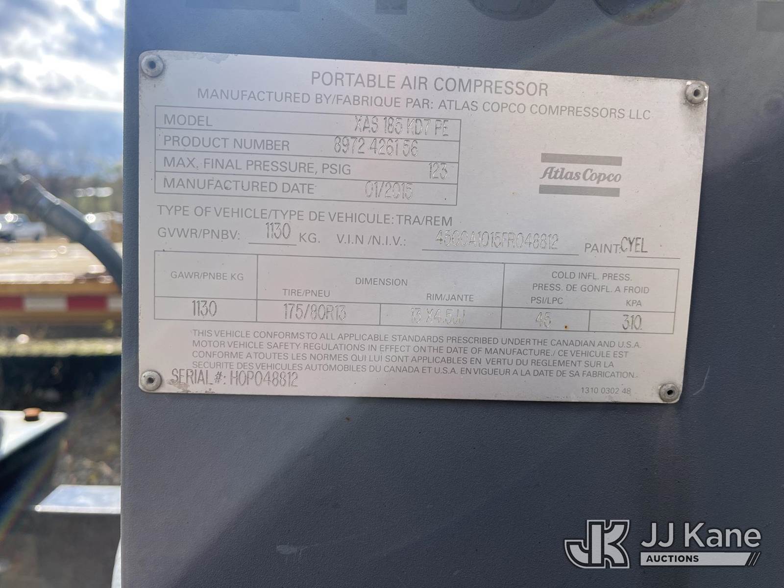 2015 Atlas Copco XAS185KD7PE Tagalong Air Compressor, s/n HOP048812, Kubota diesel, (Starts, Shuts Down, Displays Warnings) (Reads 287 hours) NOTE: This unit is being sold AS IS/WHERE IS via Timed Auction and is located in Smock, PA. Inspection & preview days for this unit are the 2 business days prior to the first day of items closing for this auction, item is located at 1000 Franklin Dr Smock, PA 15480 and hours of operations are 7:00 am to 3:30 pm. For pre-sale questions, please contact Alaina White @ (724) 562-2575 or Alaina.White@JJKane.com. (Buyer is responsible for removal. Assistance by consignor or JJ Kane Auctioneers is not assured.)