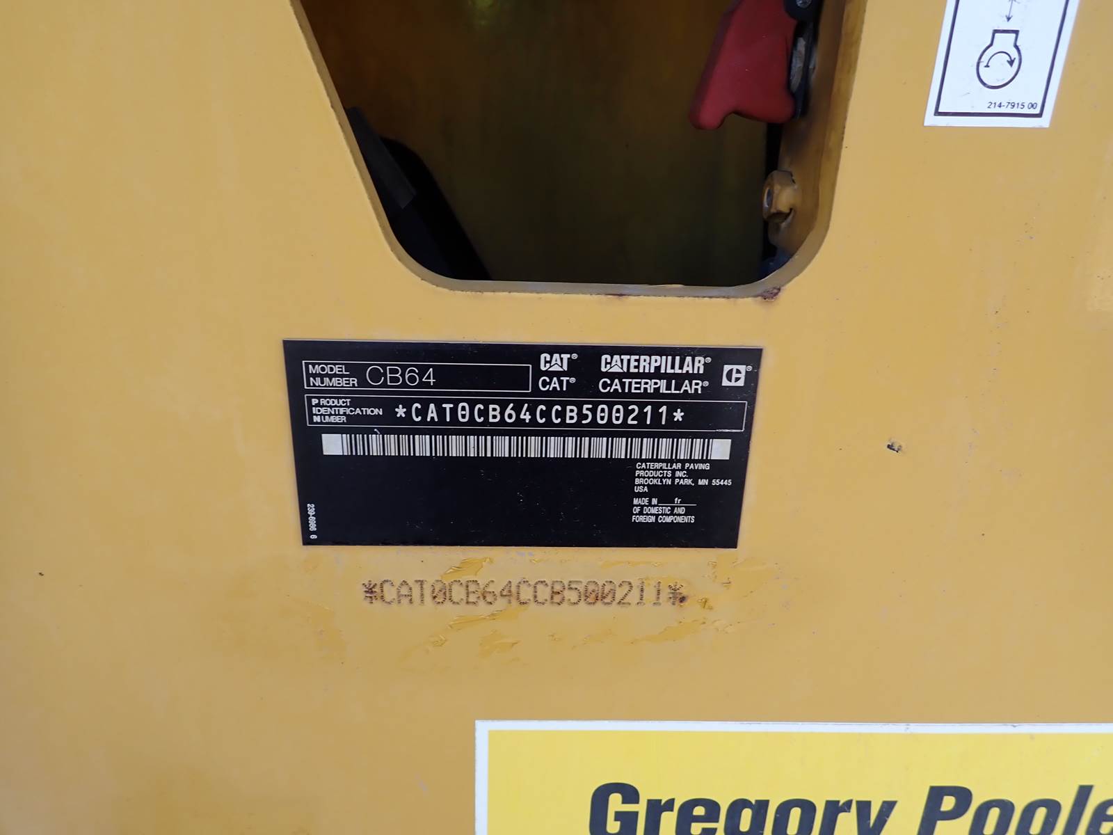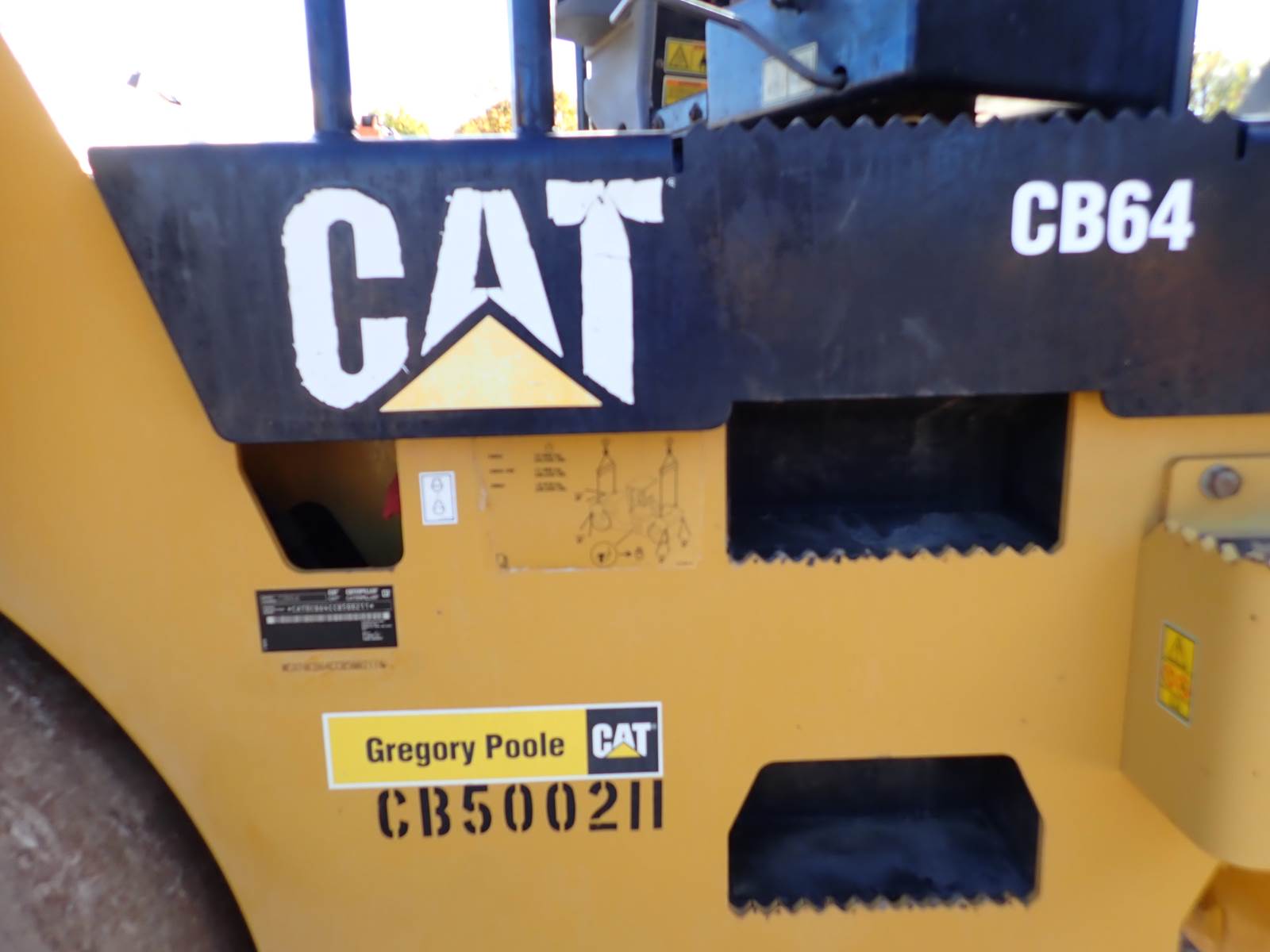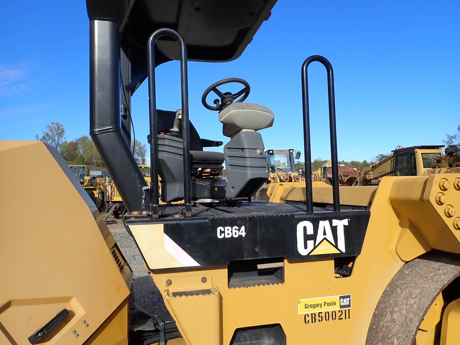2015 Caterpillar CB64 double drum roller compactor, OROPS, CAT C4.4 turbo diesel engine, PRE EMISSIONS, 4489 hours, 84" drum, swivel seat w/ air ride, hydrostatic drive, water system. GOOD RUNNING AND OPERATING ROLLER -- VERY LARGE UNIT HERE FOR BIG ROAD JOBS AND LOTS -- PRE EMISSIONS CAT DIESEL POWER -- CLEAN CONDITION -- DON'T MISS THIS ONE !!