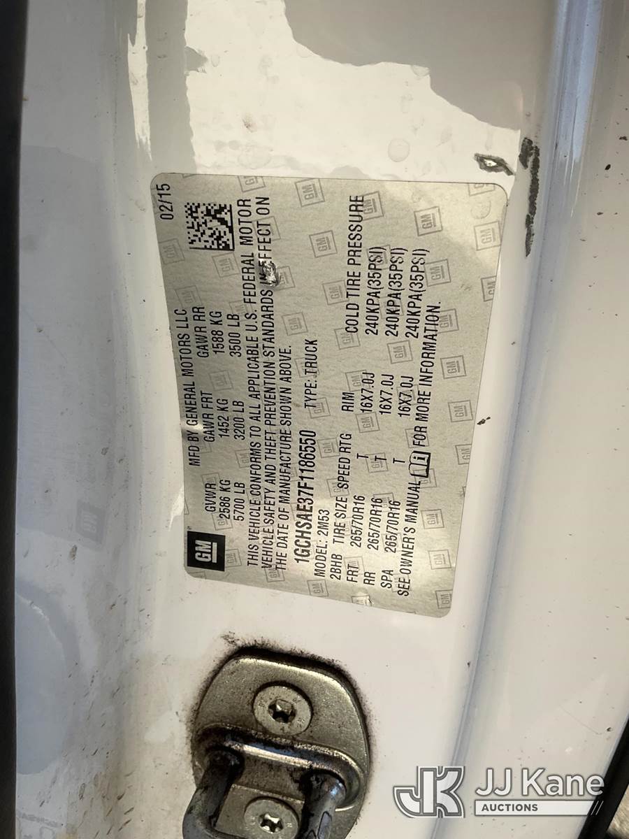 2015 Chevrolet Colorado Extended-Cab Pickup Truck, 6-cyl gas, 6-Speed Automatic, A/C, with Tow package, (67,257 miles) (Runs & Moves) This is a Titled Item NOTE: This unit is being sold AS IS/WHERE IS via Timed Auction and is located in Jurupa Valley, CA. Inspection & preview days for this unit are the 2 business days prior to the first day of items closing for this auction, item is located at 4510 Muth Way Jurupa Valley, CA 92509 and hours of operations are 8a-4p. For pre-sale questions, please contact please contact Office Staff @ (310) 353-7140. Dealer License Number 45696. (Buyer is responsible for removal. Assistance by consignor or JJ Kane Auctions is not assured.)