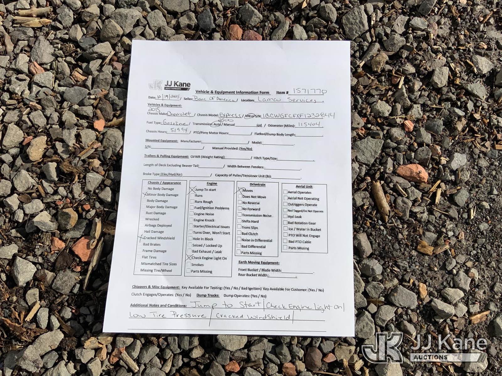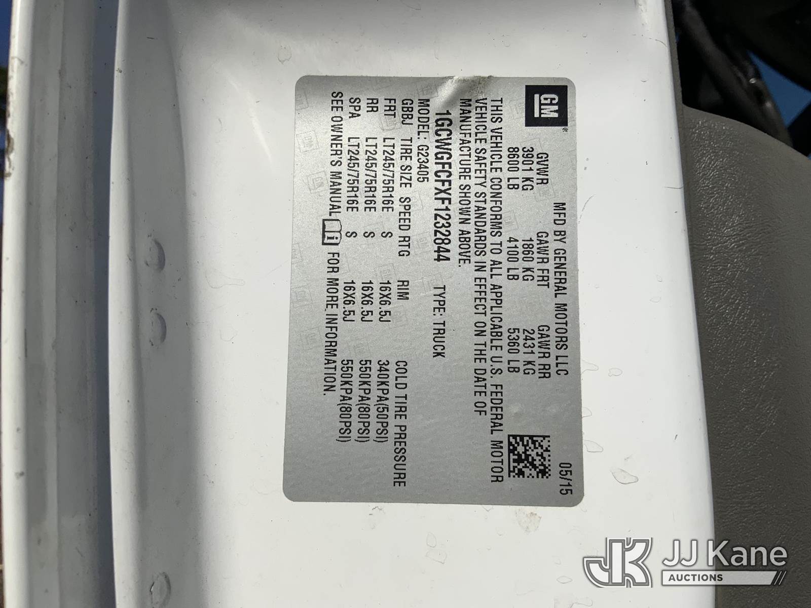 2015 Chevrolet Express G2500 Cargo Van, 4.8L V8 FFV gas, 6-Speed Automatic, RWD, A/C, (115,404 miles) (Runs & Moves) (Jump To Start, Check Engine Light On, Cracked Windshield, Body Damage) This is a Titled Item NOTE: This unit is being sold AS IS/WHERE IS via Timed Auction and is located in Graysville, AL. Inspection & preview days for this unit are by appointment only; please contact us at contact@jjkane.com or 84-Go-JJKane for more details. Alabama Auctioneer Michael Whitebread - License # 5592 (Buyer is responsible for removal. Assistance by consignor or JJ Kane Auctions is not assured.)