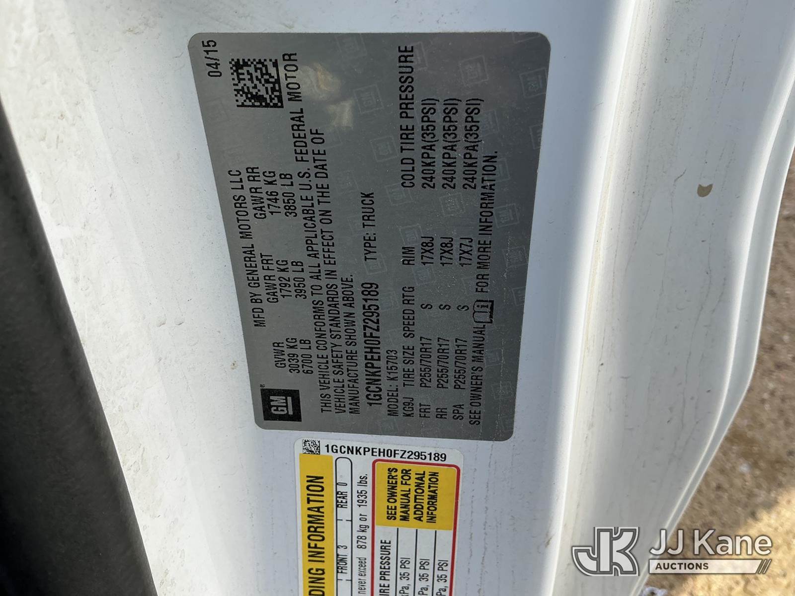2015 Chevrolet Silverado 1500 Pickup Truck, 4.3L V6 Gas Automatic, 4wd, A/C, with bed cap, (163,792 miles) (Runs & Moves) (Jump To Start, Stops Running When Jump Removed, Drivers Side Rear Light Out) (Non-Drive Away Removal Only) This is a Titled Item NOTE: This unit is being sold AS IS/WHERE IS via Timed Auction and is located in Fort Lupton, CO. Inspection & preview days for this unit are the 2 business days prior to the first day of items closing for this auction, item is located at 2105 Northland Dr Fort Lupton, CO 80621 and hours of operations are 8a-4p. For pre-sale questions, please contact Dakota Hoffman @ (720) 621-0786. Dealer License Number 47109. (Buyer is responsible for removal. Assistance by consignor or JJ Kane Auctioneers is not assured.)