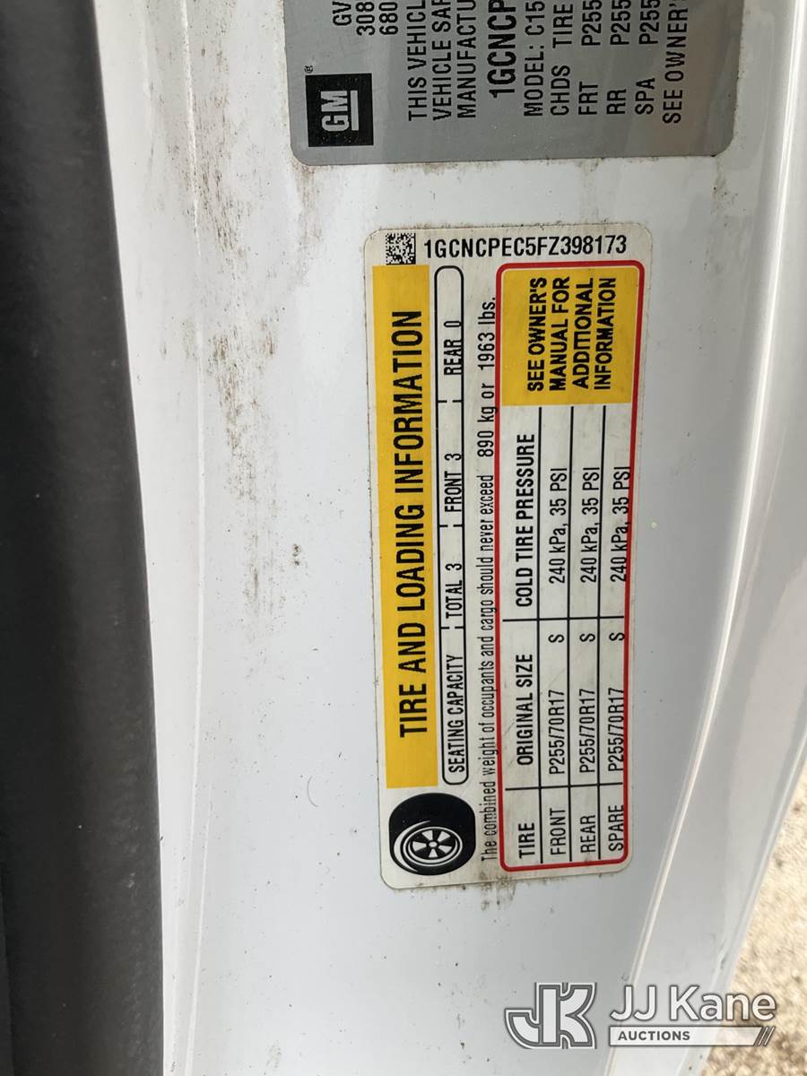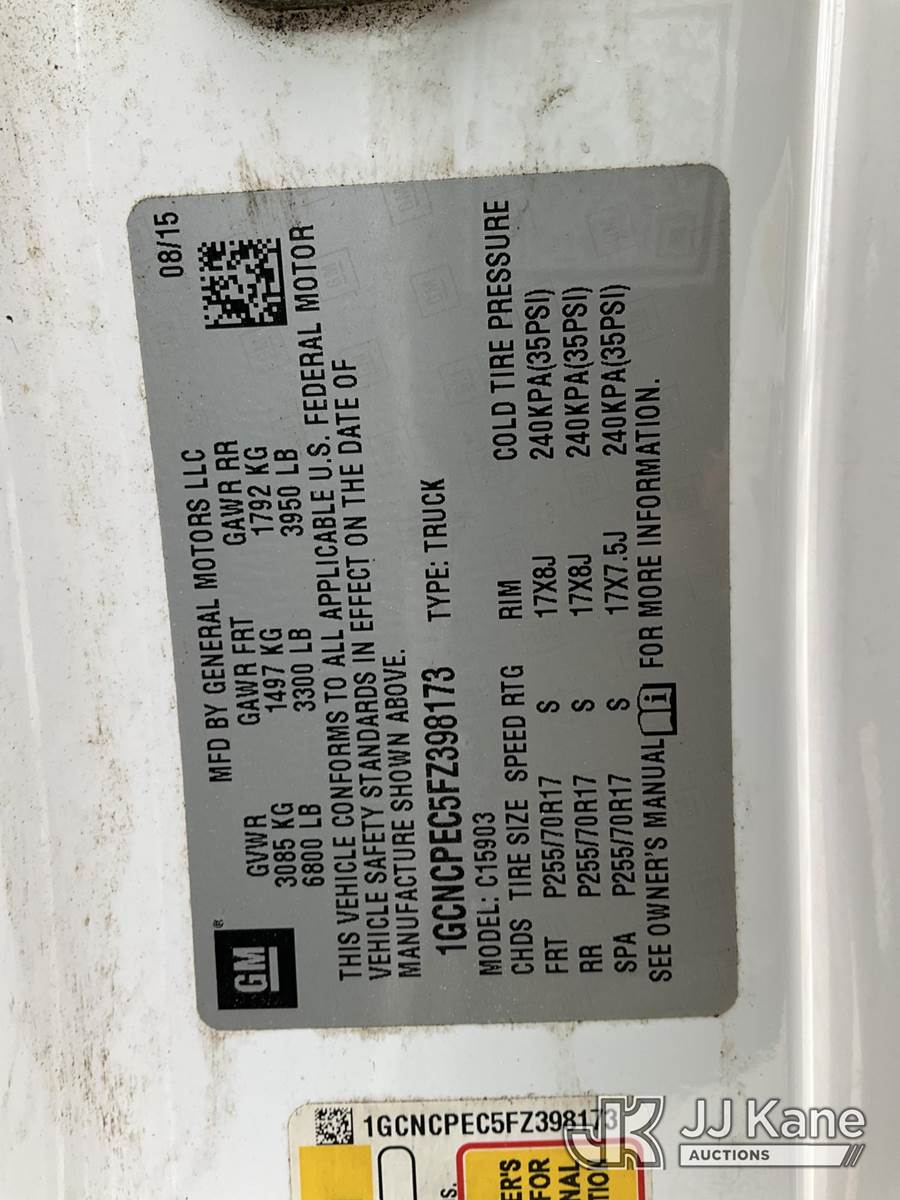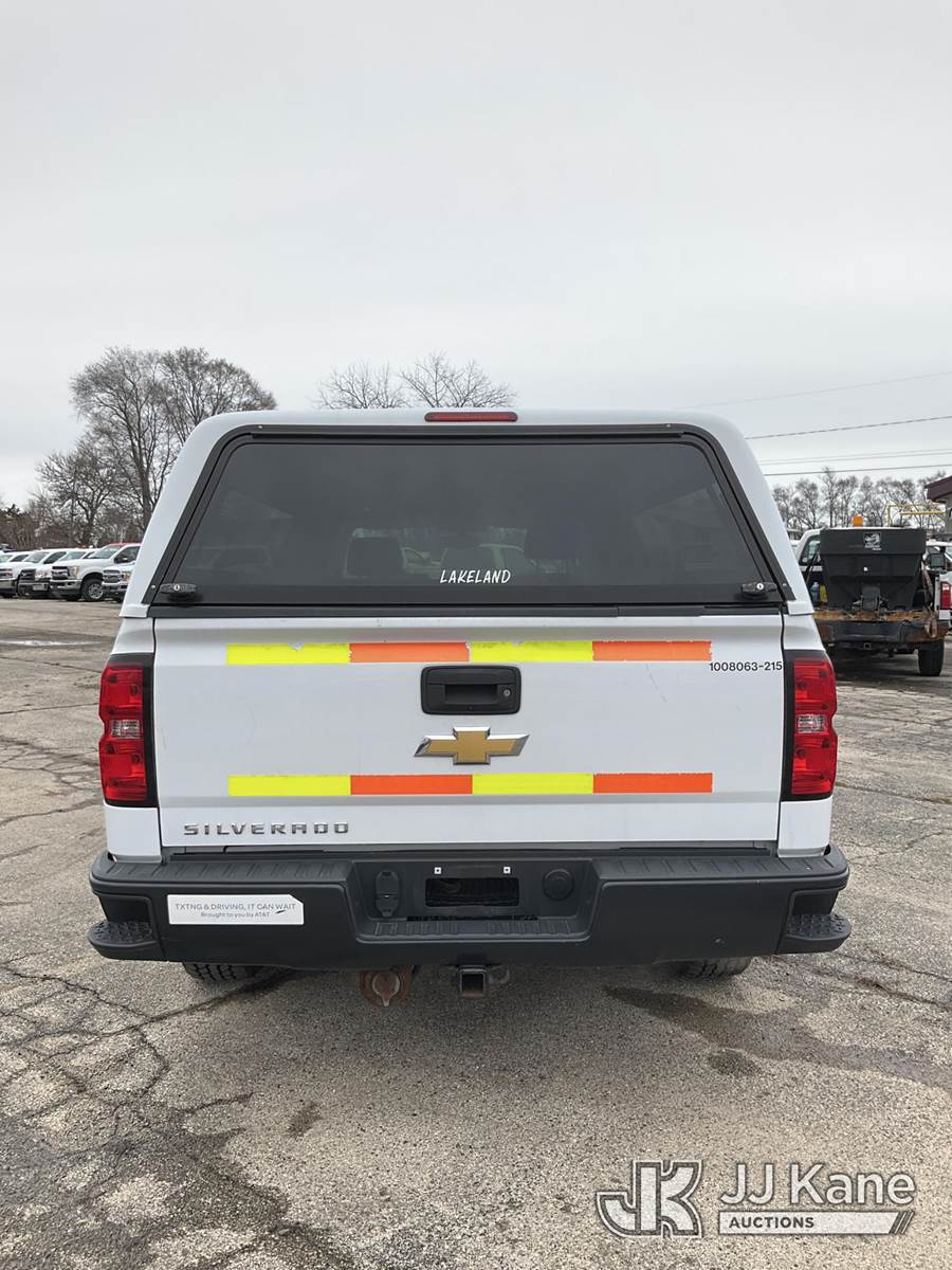 2015 Chevrolet Silverado 1500 Pickup Truck, 8-cyl gas, 6-Speed Automatic, A/C, with camper shell, (73,048 miles) (Runs & Moves) (Reads 5,912 hours) This is a Titled Item NOTE: This unit is being sold AS IS/WHERE IS via Timed Auction and is located in South Beloit, IL. Inspection & preview days for this unit are the 2 business days prior to the first day of items closing for this auction, item is located at 14354 Dearborn Ave South Beloit, IL and hours of operations are 8a-4p. For pre-sale questions, please contact Derek Eklund at (608) 904-0618 or (derek.eklund@jjkane.com). (Buyer is responsible for removal. Assistance by consignor or JJ Kane Auctions is not assured.)