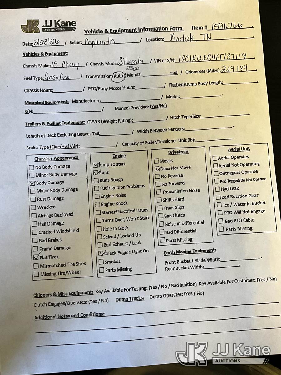 2015 Chevrolet Silverado 2500HD 4x4 Crew-Cab Pickup Truck, 6.0L V8 OHV 16V FFV gas, 6-Speed Automatic, A/C, (229,184 miles) (Runs) (Does Not Move, Condition Unknown, Jump To Start, Check Engine Light On, Flat Tires, Body/Paint Damage) (Seller States: Transmission Issue, Engine Issue, Body Damage) This is a Titled Item NOTE: This unit is being sold AS IS/WHERE IS via Timed Auction and is located in Kodak, TN. Inspection & preview days for this unit are by appointment only; please contact us at contact@jjkane.com or 84-Go-JJKane for more details. (Buyer is responsible for removal. Assistance by consignor or JJ Kane Auctions is not assured.)
