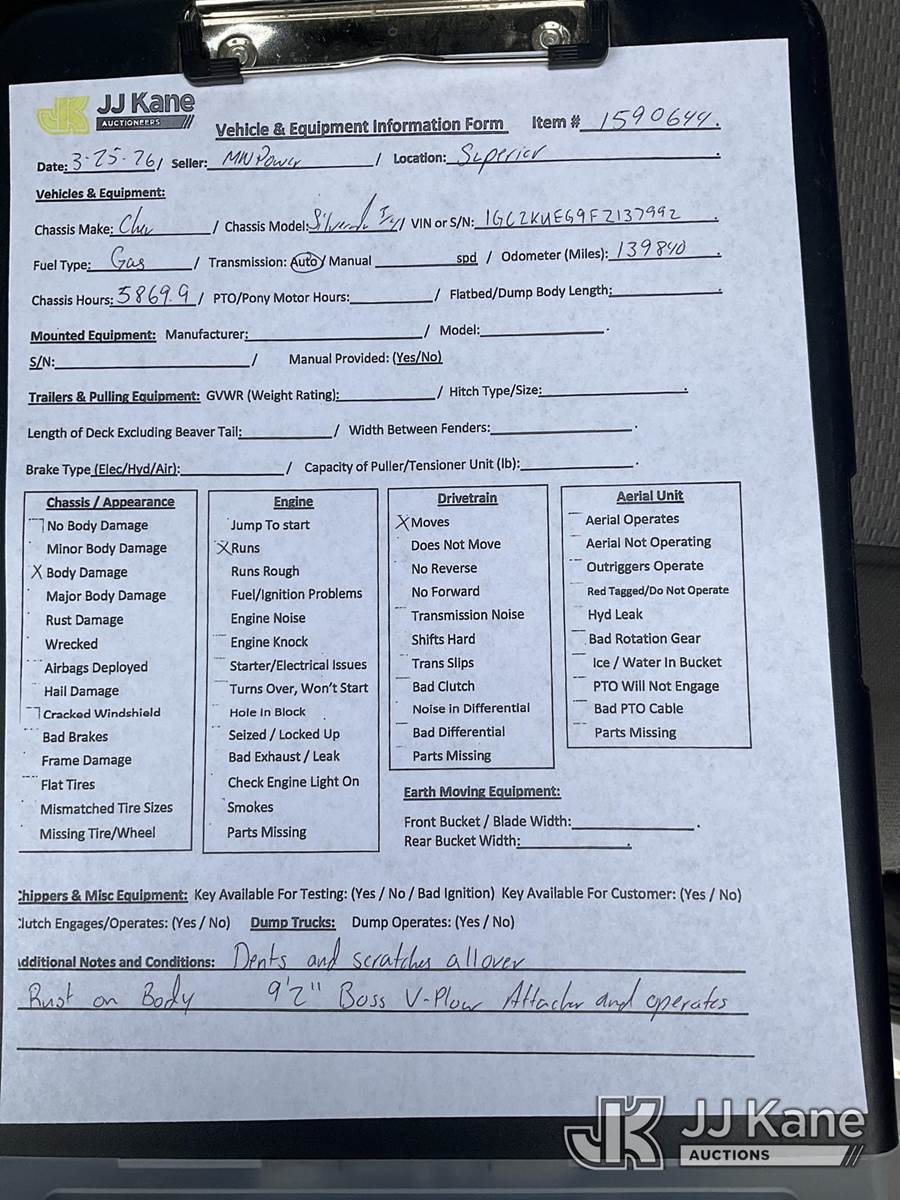 2015 Chevrolet Silverado 2500HD 4x4 Extended-Cab Pickup Truck, 6.0L V8 OHV 16V FFV gas, 6-Speed Automatic, A/C, with snow plow, (139,840 miles) (Runs & Moves) (Check Engine Light On, Body/Rust Damage) This is a Titled Item NOTE: This unit is being sold AS IS/WHERE IS via Timed Auction and is located in Superior, WI. Inspection & preview days for this unit are by appointment only; please contact us at contact@jjkane.com or 84-Go-JJKane for more details. (Buyer is responsible for removal. Assistance by consignor or JJ Kane Auctions is not assured.)
