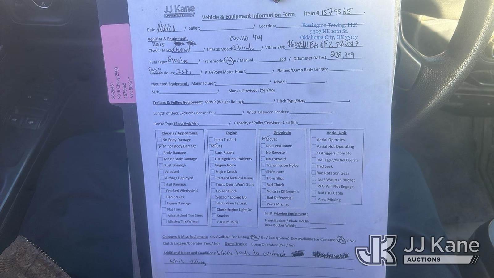 2015 Chevrolet Silverado 2500HD 4x4 Service Truck, 6.0L V8 OHV 16V FFV gas, 6-Speed Automatic, A/C, (209,999 miles) (Runs & Moves) (Check Engine Light On, Overheats While Idling, Body Damage) This is a Titled Item NOTE: This unit is being sold AS IS/WHERE IS via Timed Auction and is located in Oklahoma City, OK. For more information & removal arrangements please contact Ben Cox @ ben.cox@jjkane.com (Buyer is responsible for removal. Assistance by consignor or JJ Kane Auctions is not assured.)