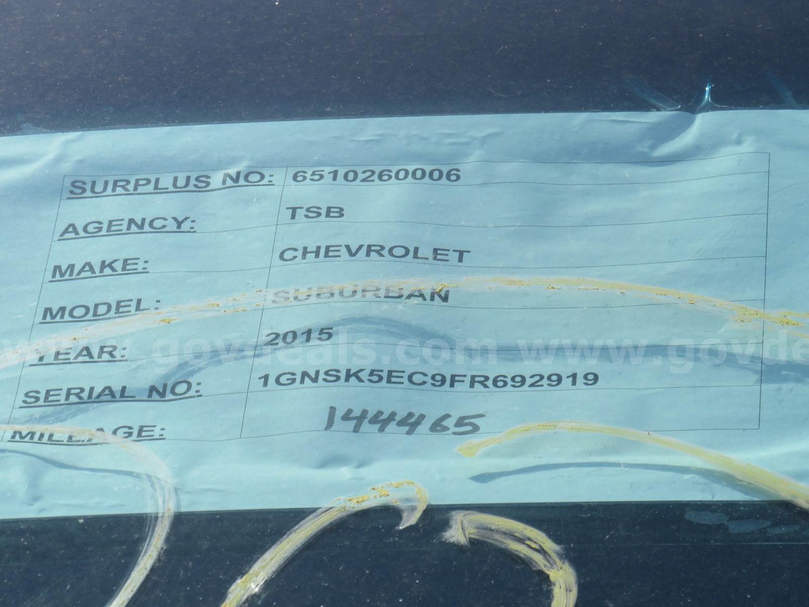 2015 Chevrolet Suburban SPORT UTILITY 4-DR, 5.3L V8 OHV 16V. This vehicle was used by a state agency and remitted to surplus with no data. There are no mechanics on site and mechanical condition is unknown. We advise in-person inspections. Our team was able to start the vehicle and it ran. No further information is known. No questions on mechanical condition will be answered as we have no further details to provide. Vehicle will be sold with title, bill of sale. We have keys for this vehicle.