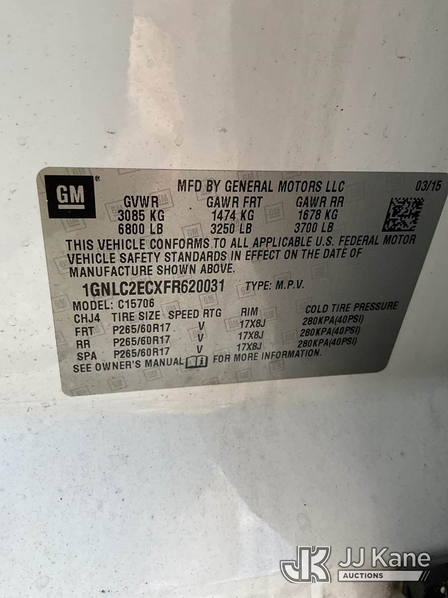 2015 Chevrolet Tahoe Police Package 4-Door Sport Utility Vehicle, 5.3L V8 OHV 16V gas, 6-Speed Automatic, A/C, (89,257 miles) (Runs & Moves) (Body/Paint Damage) This is a Titled Item NOTE: This unit is being sold AS IS/WHERE IS via Timed Auction and is located in Ocala, FL. Inspection & preview days for this unit are by appointment only; please contact us at contact@jjkane.com or 84-Go-JJKane for more details. For more information & removal arrangements please contact Mike Lessard @ (352) 629-6677. (Buyer is responsible for removal. Assistance by consignor or JJ Kane Auctions is not assured.)