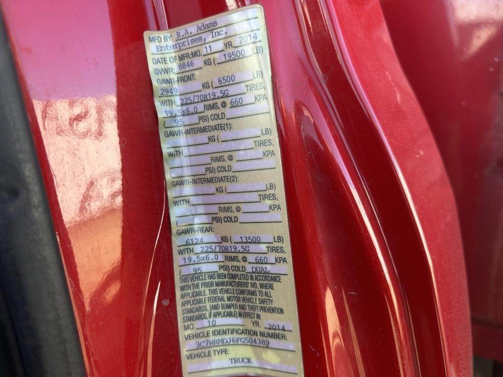 Location: ISA Yard: Merrill, WI 6.4L V8 Gasoline Engine, Automatic Transmission, GVWR: 19500LB, Spring Ride, PTO, Approx 14' Dump Box W/ Folding Sides, Storage Box, Pintle Hitch, Heat, A/C, Radio, (4) Auxiliary Switches, Integrated Trailer Brake Controller, Cruise Control, 225/70R19.5 Tires VIN: 3C7WRMDJ6FG504389 Miles Shown: 209030