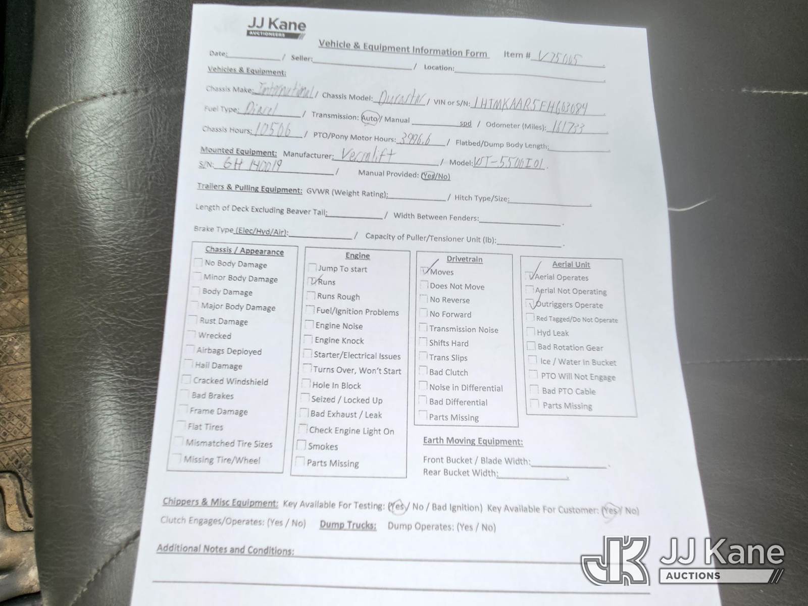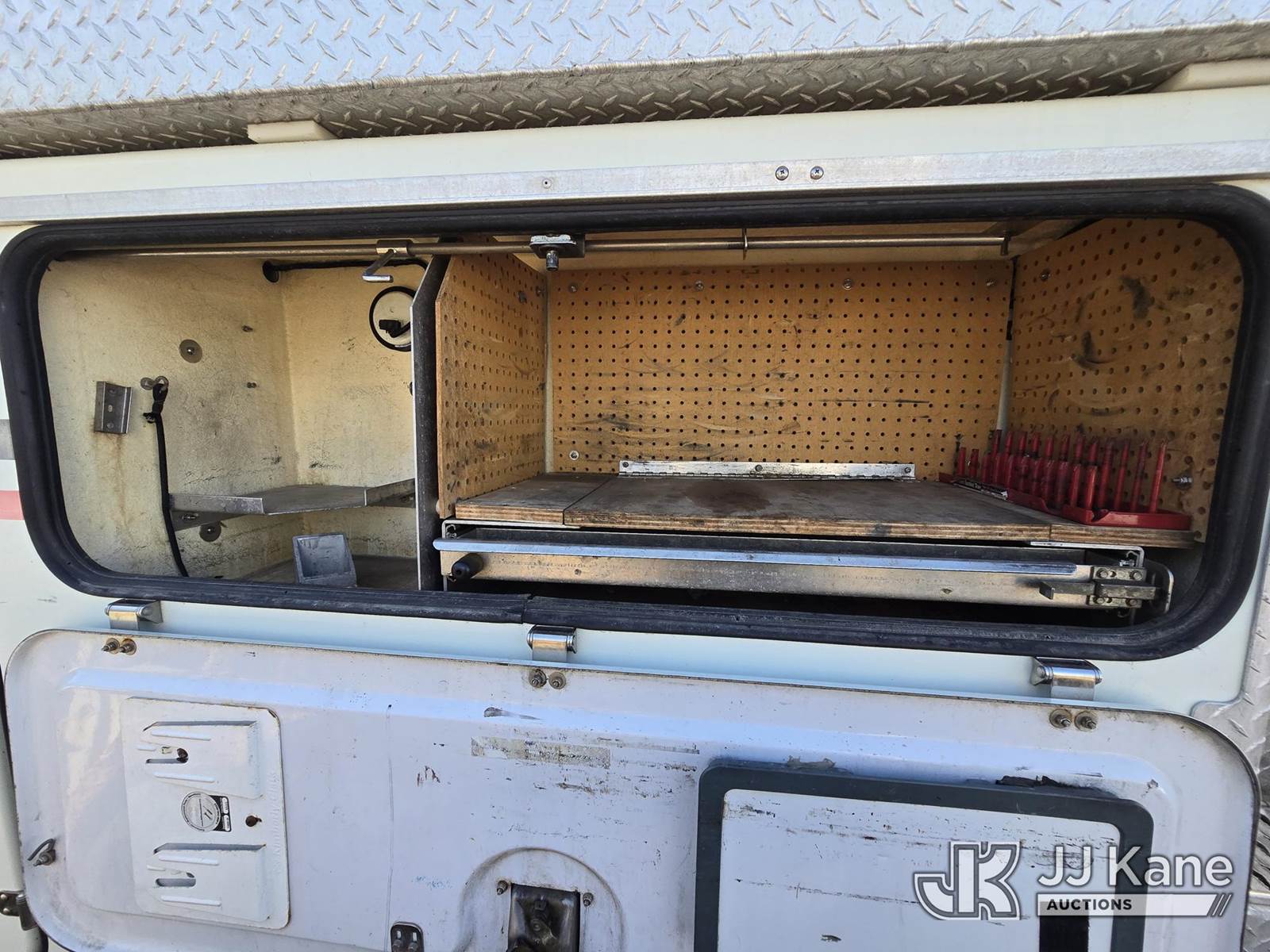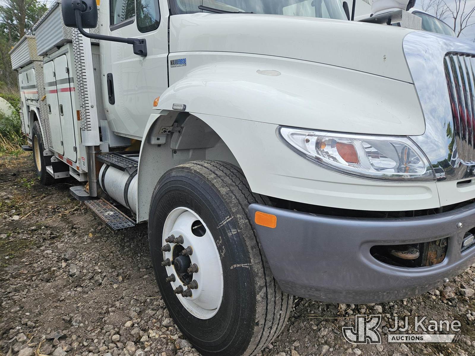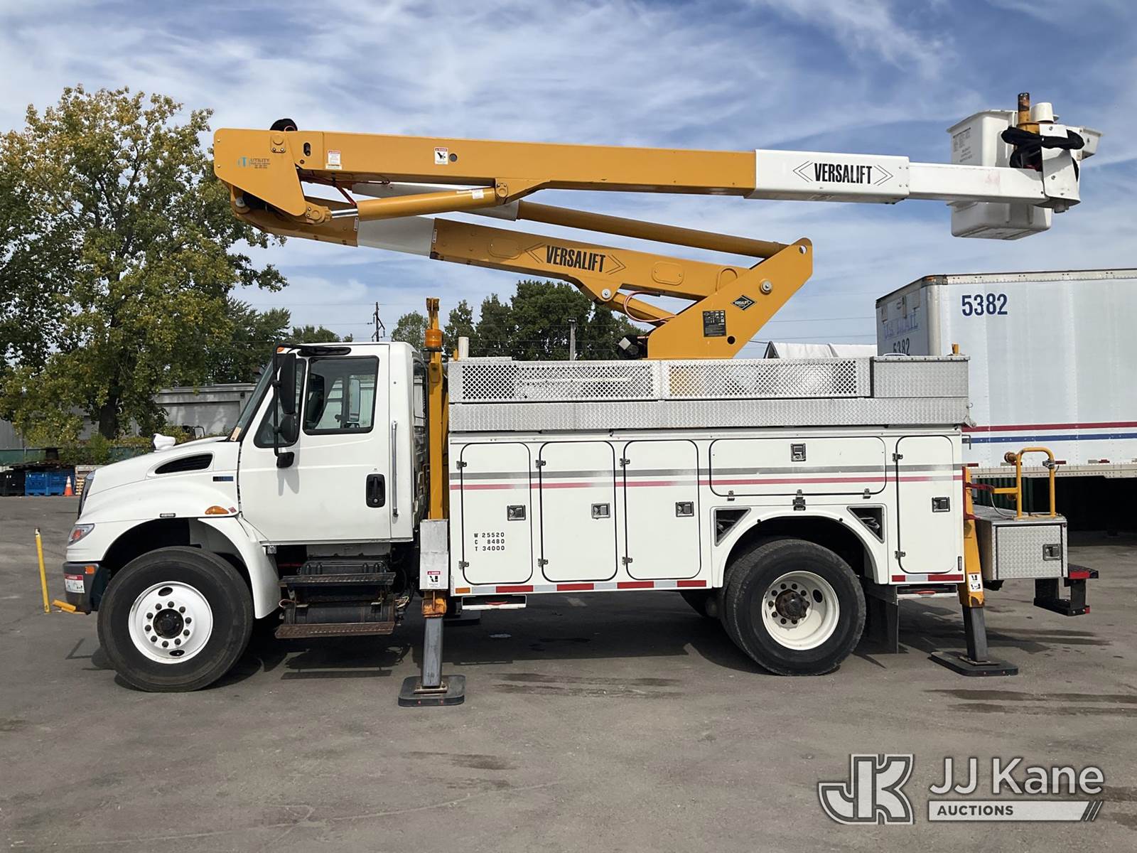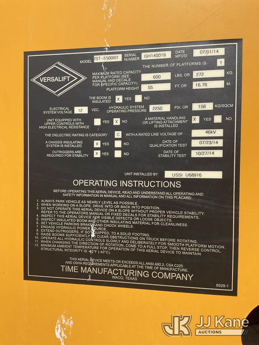 Duralift VST-5500I01, 60 ft, Articulating & Telescopic Material Handling Bucket Truck s/n GH140019, with single-man bucket, mounted behind cab on 2015 International 4400 Utility Truck, 7.6L Auto, 4X2, diesel, A/C, (161,733 miles) (Runs, Moves & Upper Operates) (Reads 10,506 hours) This is a Titled Item NOTE: This unit is being sold AS IS/WHERE IS via Timed Auction and is located in Oshkosh, WI. Inspection & preview days for this unit are by appointment only; please contact us at contact@jjkane.com or 84-Go-JJKane for more details. (Missing manuals, See Auction Company for Manufacturers Information to obtain manuals) (Buyer is responsible for removal. Assistance by consignor or JJ Kane Auctioneers is not assured.)