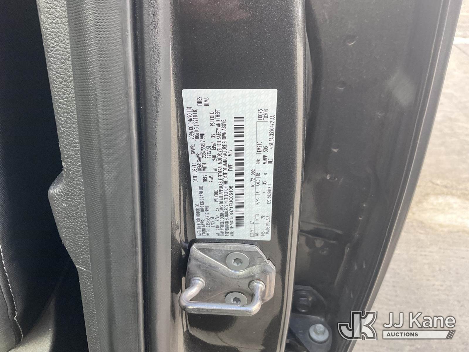 2015 Ford Escape 4-Door Sport Utility Vehicle, s/n 1FMCU0G71FUC06106, 2.5L L4 DOHC 16V 6-Speed Automatic, FWD, GAS, A/C, (75,600 miles) (Runs & Moves) (Minor Scratch/Dent) This is a Titled Item NOTE: This unit is being sold AS IS/WHERE IS via Timed Auction and is located in Dixon, CA. Inspection & preview days for this unit are the 2 business days prior to the first day of items closing for this auction, item is located at 8668 Sparling Ln Dixon, CA 95620 and hours of operations are 8a-4p. For pre-sale questions, please contact JJ Kane Staff at (707) 678-8060 (dixon@jjkane.com). Dealer License Number 45696. (Buyer is responsible for removal. Assistance by consignor or JJ Kane Auctioneers is not assured.)