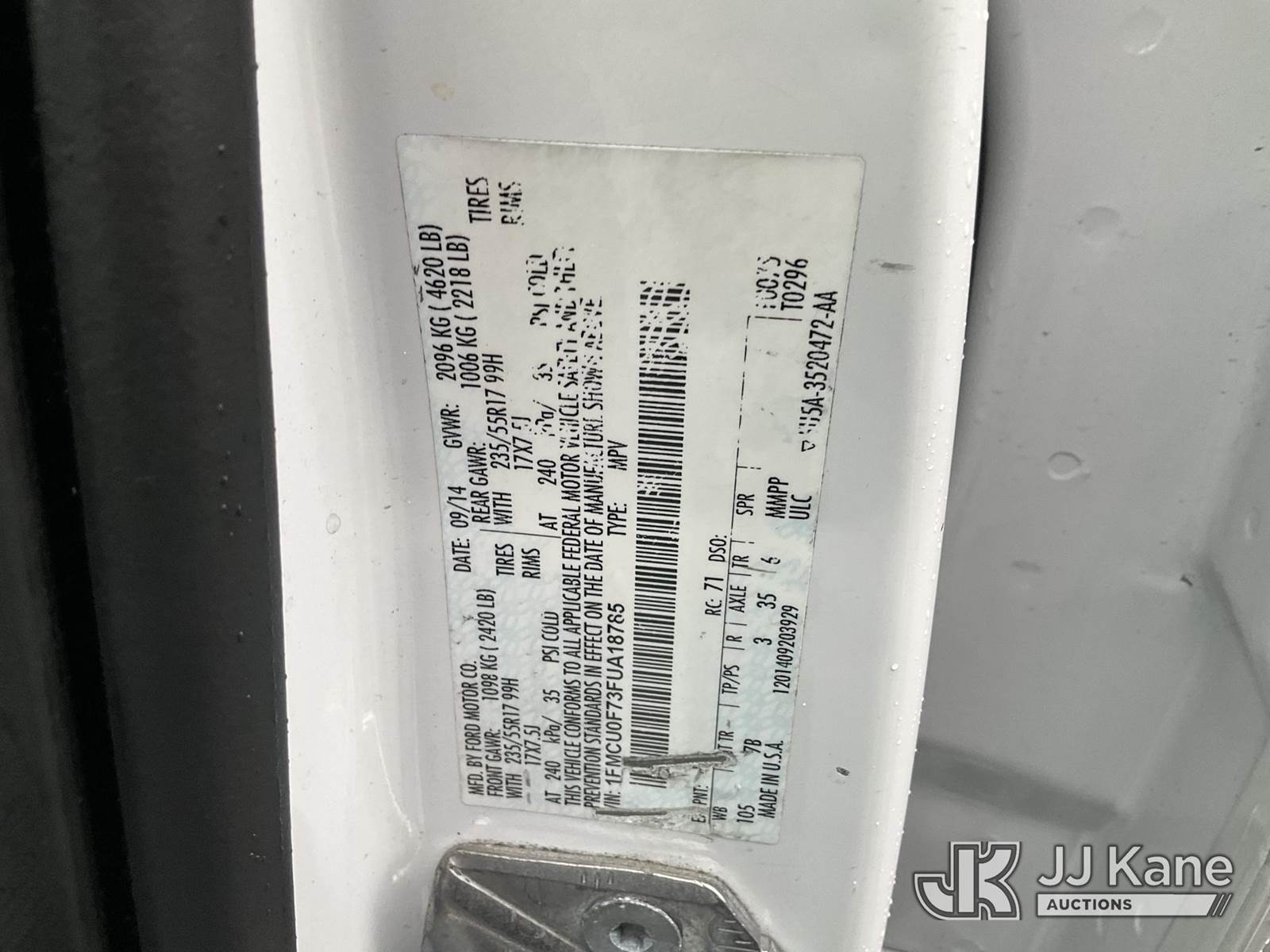 2015 Ford Escape 4-Door Sport Utility Vehicle, s/n 1FMCU0F73FUA18785, 4-cyl gas, FWD, 6-Speed Automatic, A/C, (46,939 miles) Open Recall, Remedy Not Yet Available, Vehicle is subject to an open NHTSA safety recall related to ON YOUR VEHICLE, THE REAR VIEW CAMERA COULD DISPLAY A BLANK OR DISTORTED IMAGE ON THE CENTER DISPLAY SCREEN WHEN THE VEHICLE IS IN REVERSE. YOU MAY ALSO RECEIVE A MESSAGE THAT THE REAR VIEW CAMERA IS UNAVAILABLE ON THE CENTER DISPLAY SCREEN., but a remedy for this recall does not appear to be available. Dealer is not authorized to perform the recall repair. Periodically contact the manufacturer or check the VIN on the NHTSA website at www.safercar.govivin to determine whether a remedy for the recall is available. As soon as a remedy is available, arrange to have the recall remedied with a dealer from that make of car to make such repair. (Runs & Moves) (Passed Smog, Open Recall, Remedy Not Yet Available) (Bidding Restricted to Licensed Vehicle Dealers Only), This is a Titled Item NOTE: This unit is being sold AS IS/WHERE IS via Timed Auction and is located in Jurupa Valley, CA. Inspection & preview days for this unit are the 2 business days prior to the first day of items closing for this auction, item is located at 4510 Muth Way Jurupa Valley, CA 92509 and hours of operations are 8a-4p. For pre-sale questions, please contact please contact Office Staff @ (310) 353-7140. Dealer License Number 45696. (Buyer is responsible for removal. Assistance by consignor or JJ Kane Auctions is not assured.)