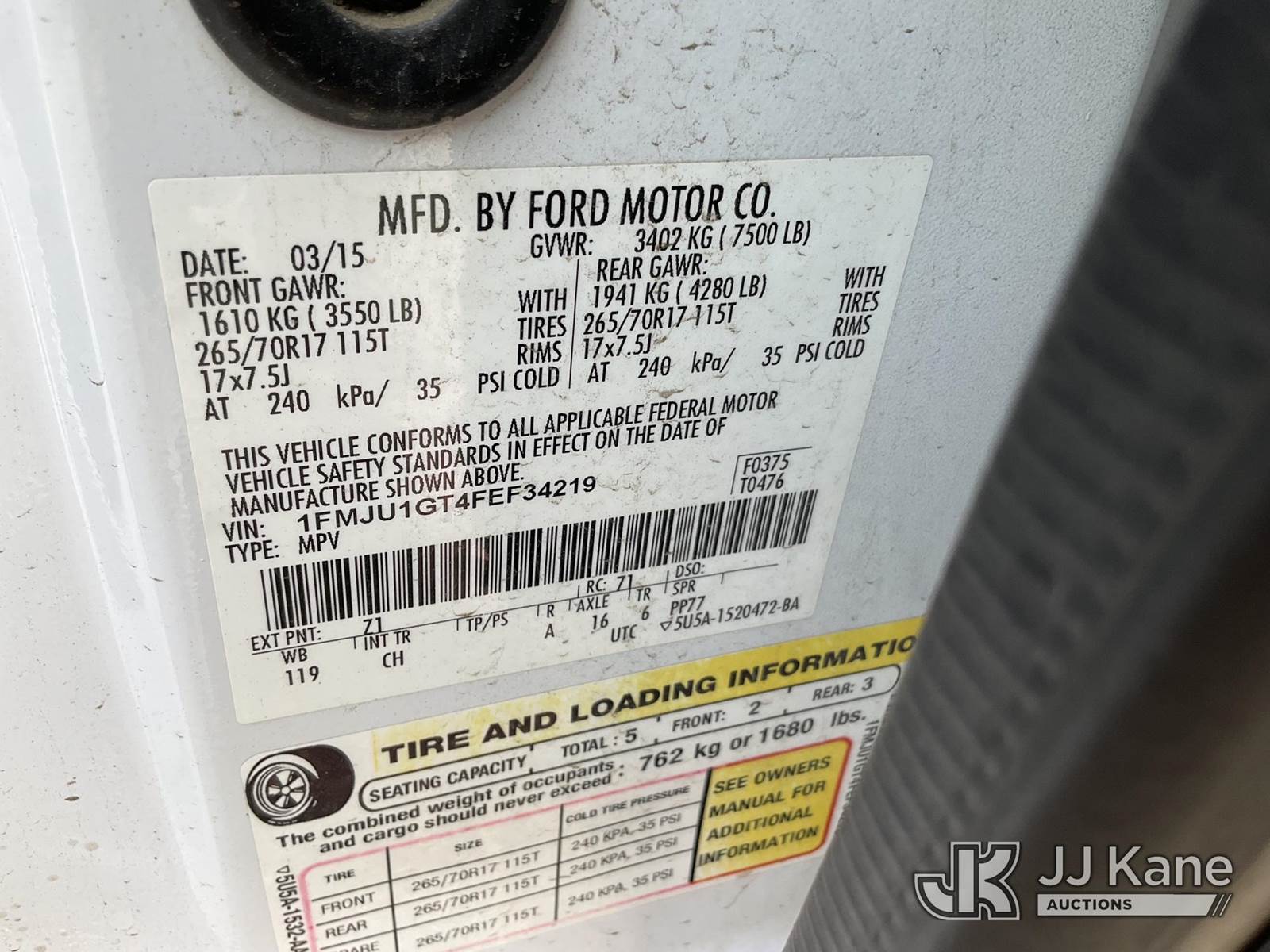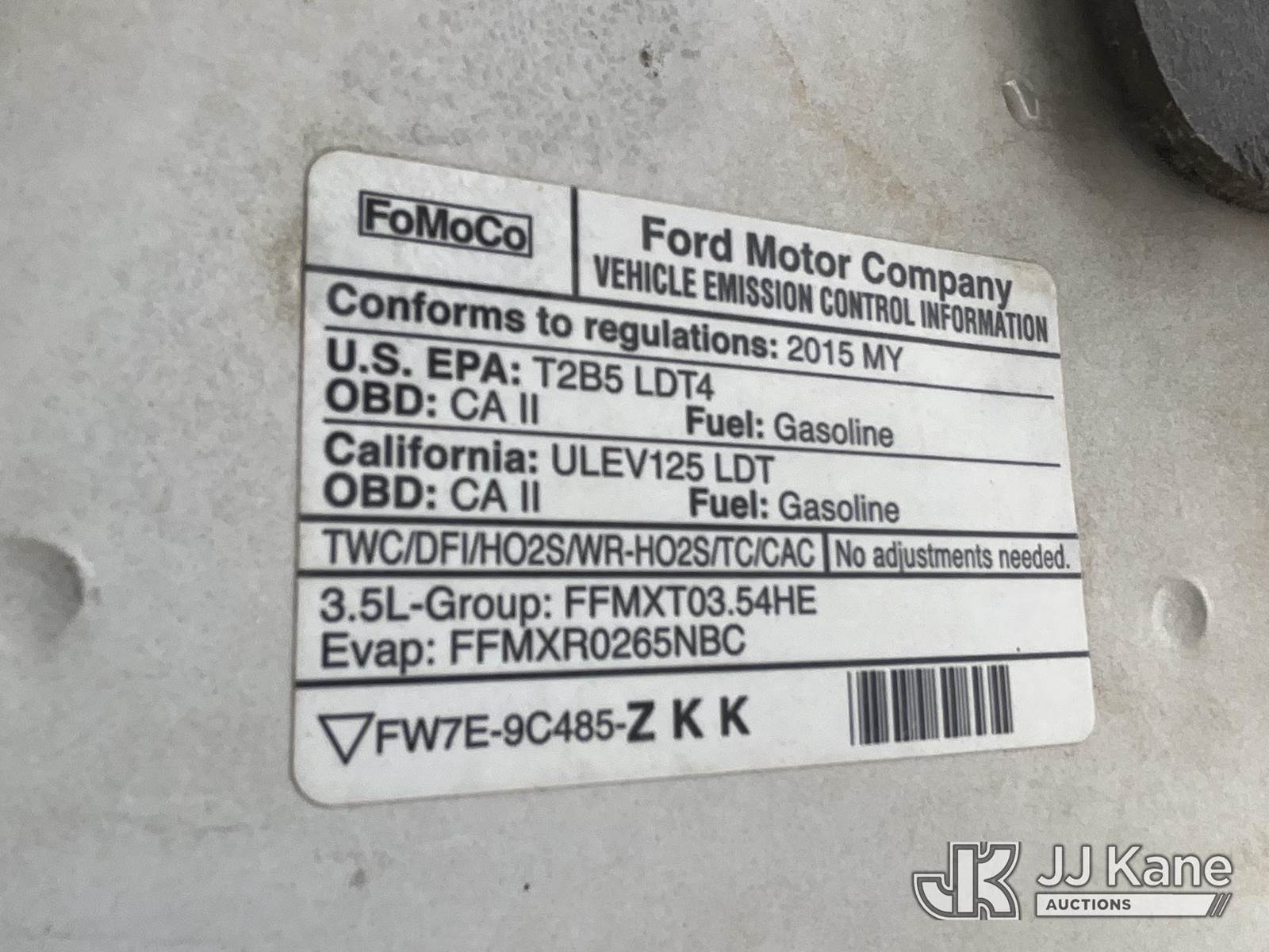 2015 Ford Expedition XL 4WD 4-Door Sport Utility Vehicle, s/n 1FMJU1GT4FEF34219, 3.5L V6 DOHC 24V FFV, 6-Speed Automatic, A/C, with Tow package, (128,936 miles) Vehicle is subject to an open NHTSA safety recall related to A REAR VIEW CAMERA THAT DISPLAYS A BLANK OR DISTORTED IMAGE WHILE IN REVERSE CAN REDUCE OR DISTORT THE DRIVERS VIEW OF WHAT IS BEHIND THE VEHICLE, INCREASING THE RISK OF A CRASH, but a remedy for this recall does not appear to be available. Dealer is not authorized to perform the recall repair. Periodically contact the manufacturer or check the VIN on the NHTSA website at www.safercar.gov to determine whether a remedy for the recall is available. As soon as a remedy is available, arrange to have the recall remedied with a dealer from that make of car to make such repair. (Runs & Moves, Interior Stripped Of Parts, Open Recall, Remedy Not Yet Available) (Bidding Restricted to Licensed Vehicle Dealers Only), This is a Titled Item NOTE: This unit is being sold AS IS/WHERE IS via Timed Auction and is located in Jurupa Valley, CA. Inspection & preview days for this unit are the 2 business days prior to the first day of items closing for this auction, item is located at 4510 Muth Way Jurupa Valley, CA 92509 and hours of operations are 8a-4p. For pre-sale questions, please contact please contact Office Staff @ (310) 353-7140. Dealer License Number 45696. (Buyer is responsible for removal. Assistance by consignor or JJ Kane Auctions is not assured.)