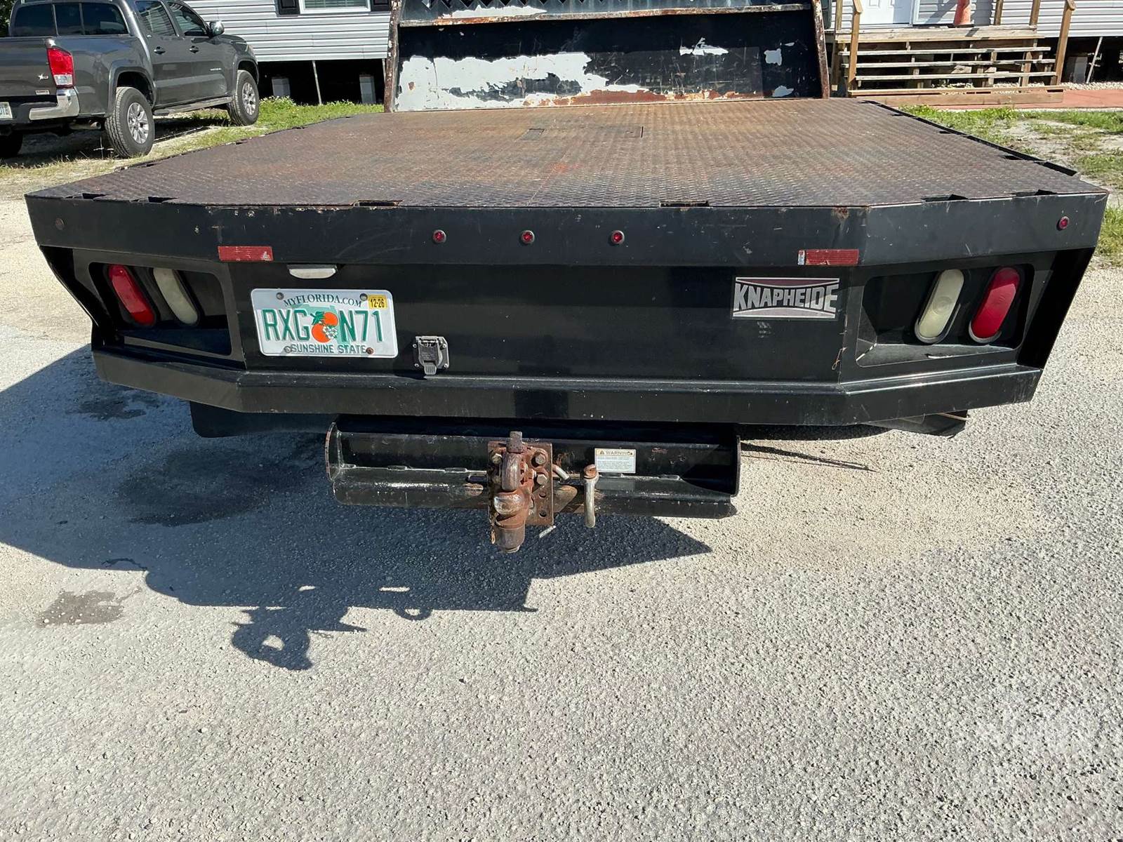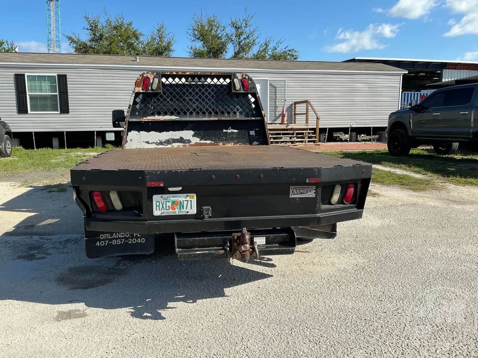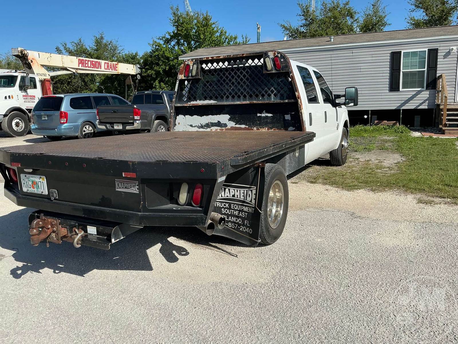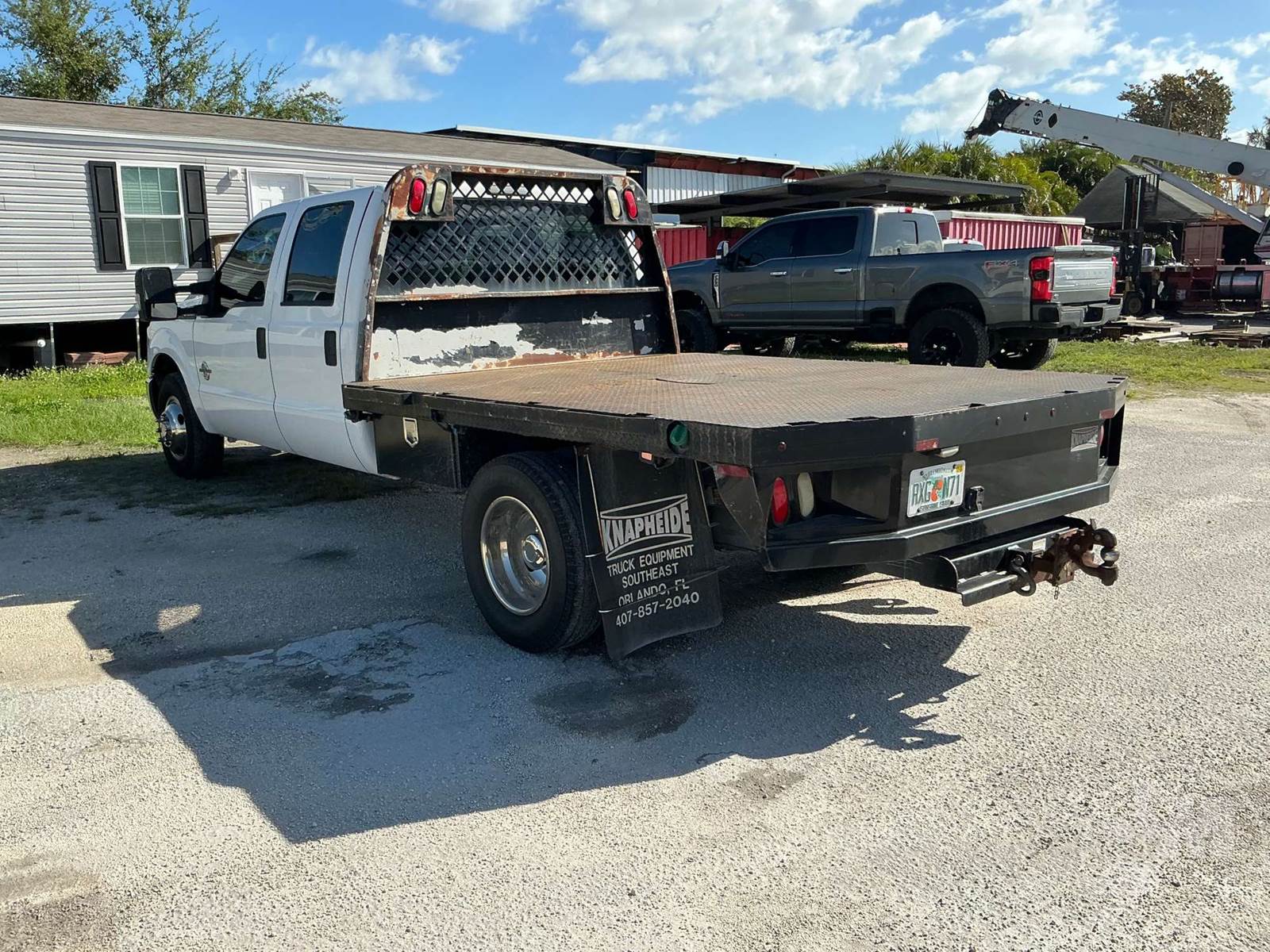 SINGLE AXLE CREW CAB FLATBED TRUCK, 9', STEEL BED, 6.7L DSL, AUTOMATIC, HEADACHE RACK, 9'6" X 8' KNAPHEIDE FLAT BED WITH HEADACHE RACK UNDER BED TOOL BOXES,, ODOMETER READS: 131487
