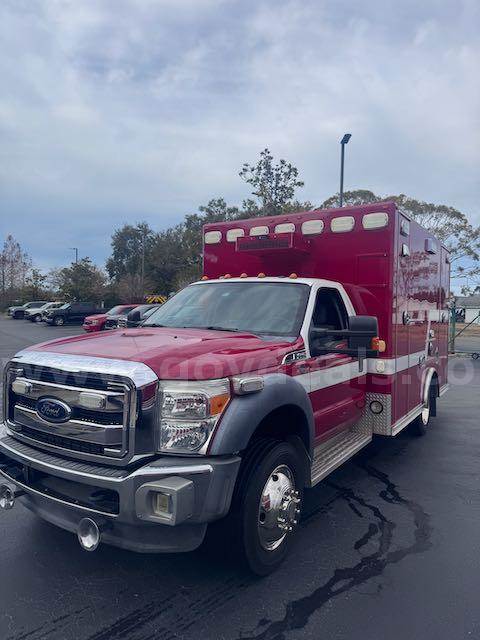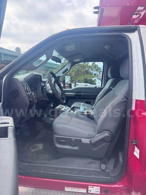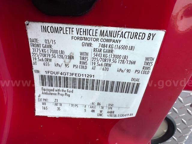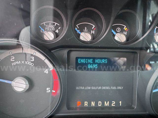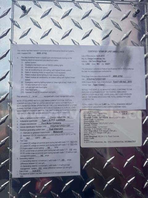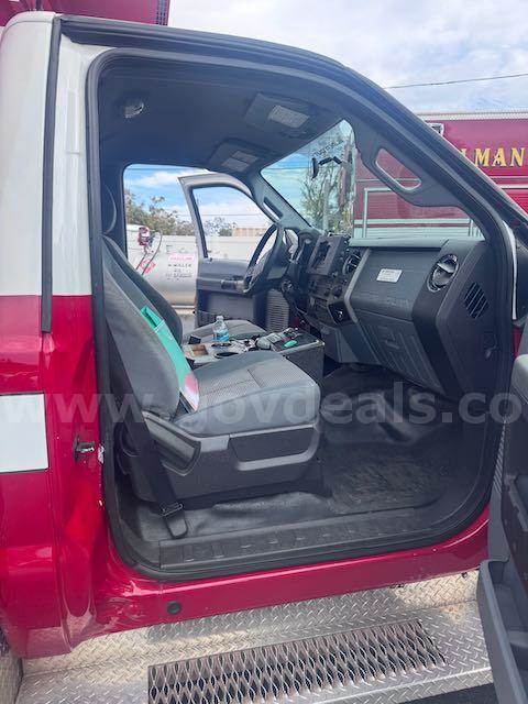 2015 OSAGE WARRIOR ON 2015 Ford F-450 SD CONVENTIONAL CAB, 6.7L V8 OHV 16V DIESEL. Equipped with Liquid spring suspension system on Rear. Starts and runs. Automatic transmission. Engine hours and Idle hours are visible in photos. Exterior: Red and White with dings and scratches. clear coat pealing from top of box, hood and several other places. No cracked glass. Interior cab : Grey cloth seats. A/C, AM/FM radio. Some decals have been removed, impressions remain. Equipment may have been removed; there may be holes in the interior and/or exterior, which may or may not have been plugged. All emergency waring devices will be disabled if not purchased by an ESD or vehicle broker.
