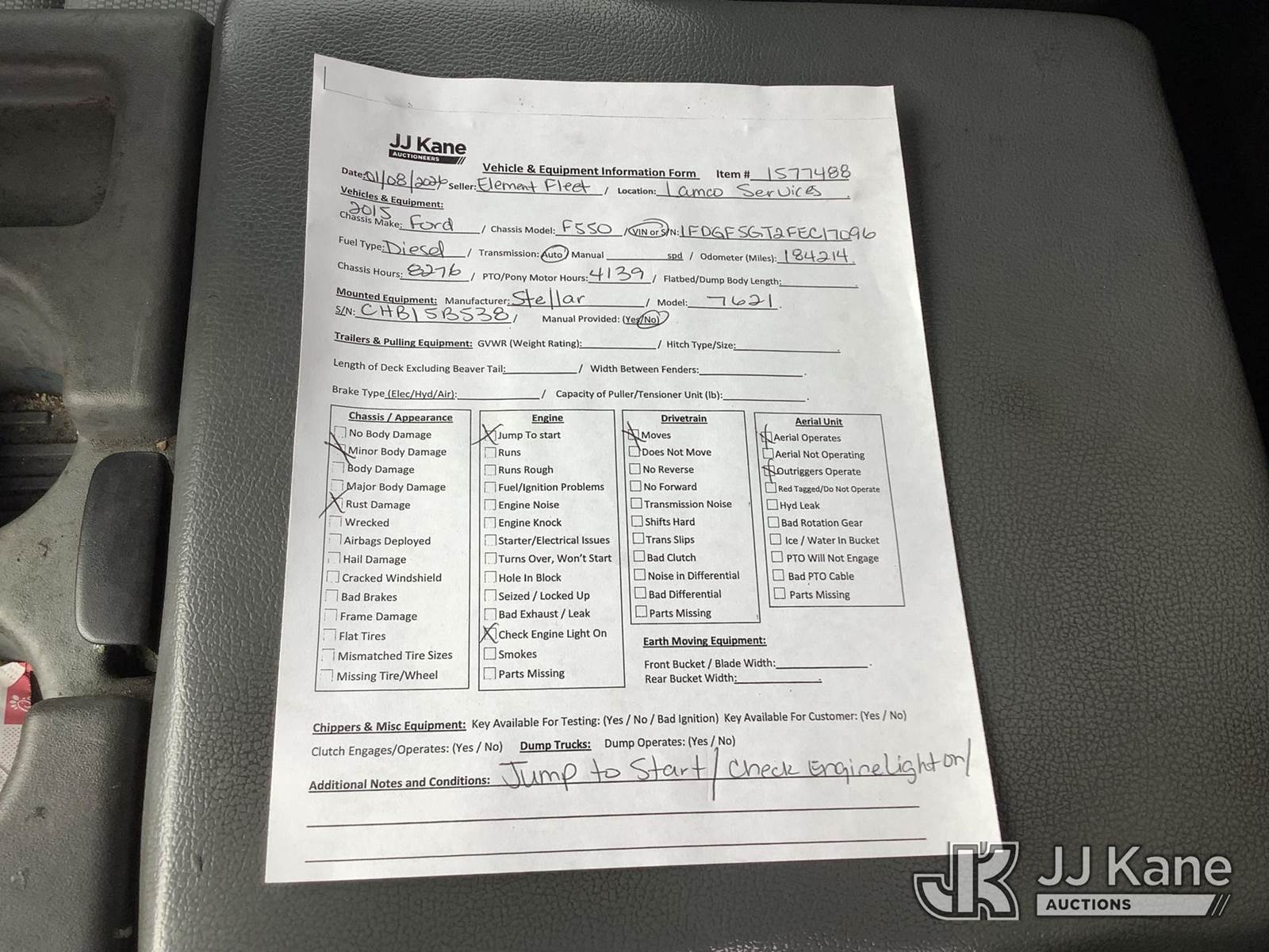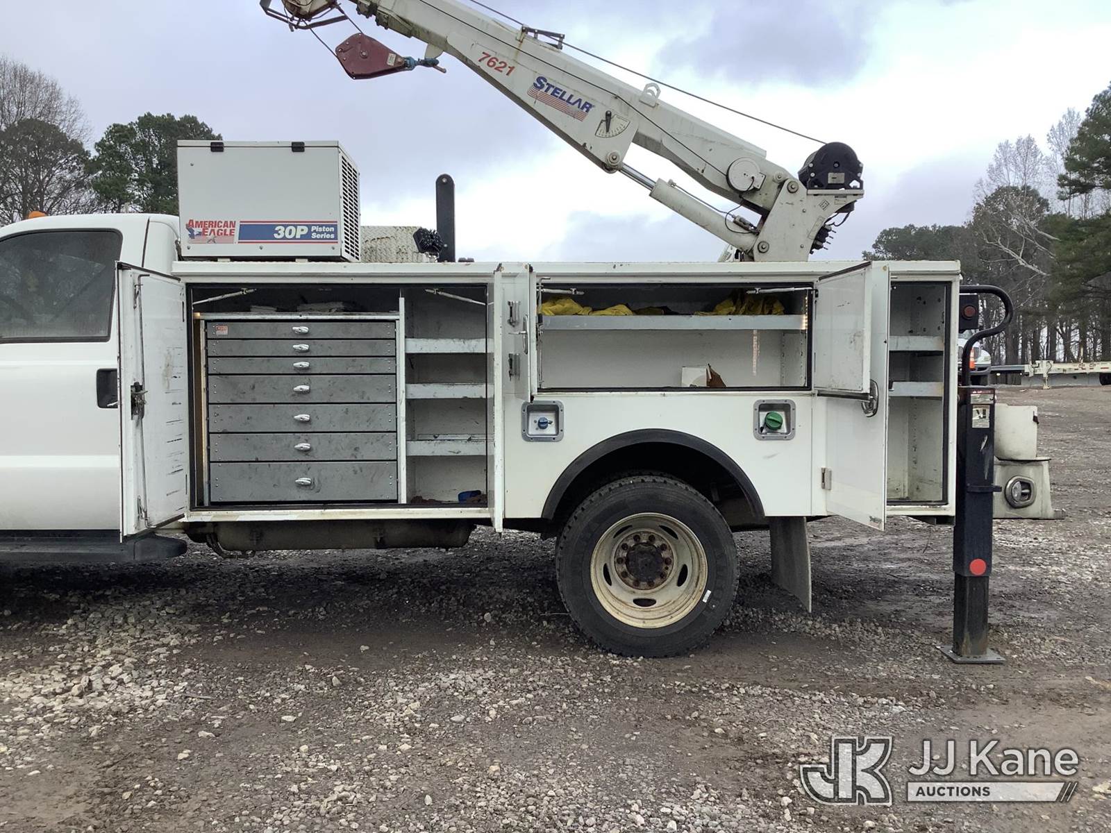 2015 Ford F-550 Mechanics Service Truck, 6.7L V8 OHV 16V diesel, Auto, RWD, A/C, with Stellar 7621 material crane w/ remote & 2 stabilizers, American Eagle 30P Piston Series air compressor, (184,214 miles) (Runs, Jump To Start, Moves, Check Engine Light On, Crane Operates) This is a Titled Item NOTE: This unit is being sold AS IS/WHERE IS via Timed Auction and is located in Graysville, AL. Inspection & preview days for this unit are by appointment only; please contact us at contact@jjkane.com or 84-Go-JJKane for more details. Alabama Auctioneer Michael Whitebread - License # 5592 (Buyer is responsible for removal. Assistance by consignor or JJ Kane Auctions is not assured.)