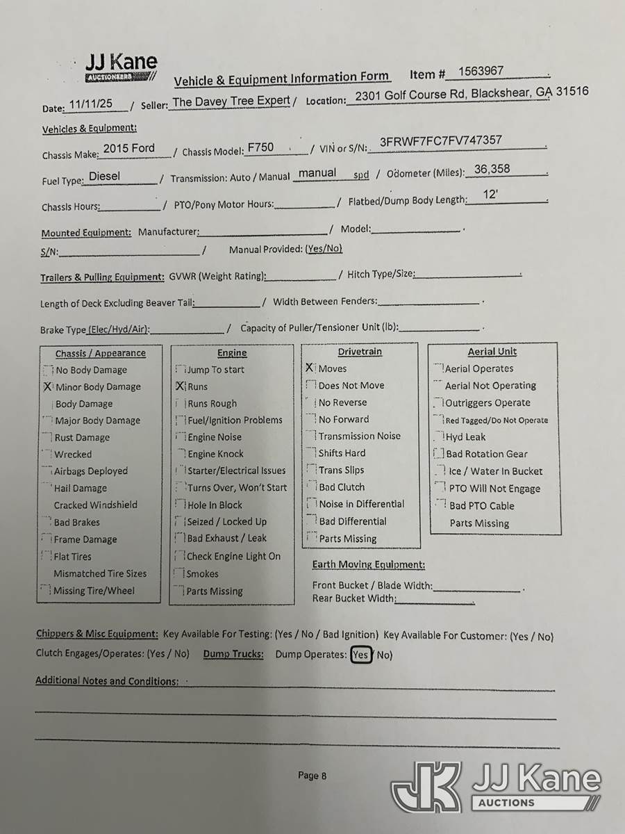 2015 Ford F-750 Chipper Dump Truck, 6.7L 6-spd, diesel, A/C, (36,357 miles) (Runs, Moves & Dump Operates) (Minor Body Damage) This is a Titled Item NOTE: This unit is being sold AS IS/WHERE IS via Timed Auction and is located in Blackshear, GA. Inspection & preview days for this unit are by appointment only; please contact us at contact@jjkane.com or 84-Go-JJKane for more details. (Buyer is responsible for removal. Assistance by consignor or JJ Kane Auctioneers is not assured.)