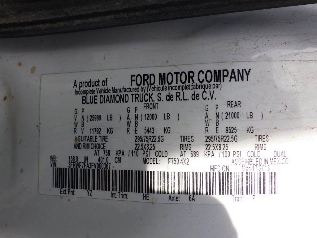 Description VIN: 3FRWF7FA3FV000367 6.7L 8-Cyl Turbo Diesel, Automatic, Air Brakes, A/C, AM/FM, Trailer Brake Controller, Cruise Control, Heated Mirrors, Vinyl Interior, Spring Suspension, PTO, DEF, Cargo Cover System, Wheel Base 158, 12,000LB Front Axle, 21,000LB Rear Axle, 295/75R22.5 Tires, GVWR 25,999LBS, Odometer Reading: 39,379 Disclaimer: Mileage and hours are visually observed and not verified.