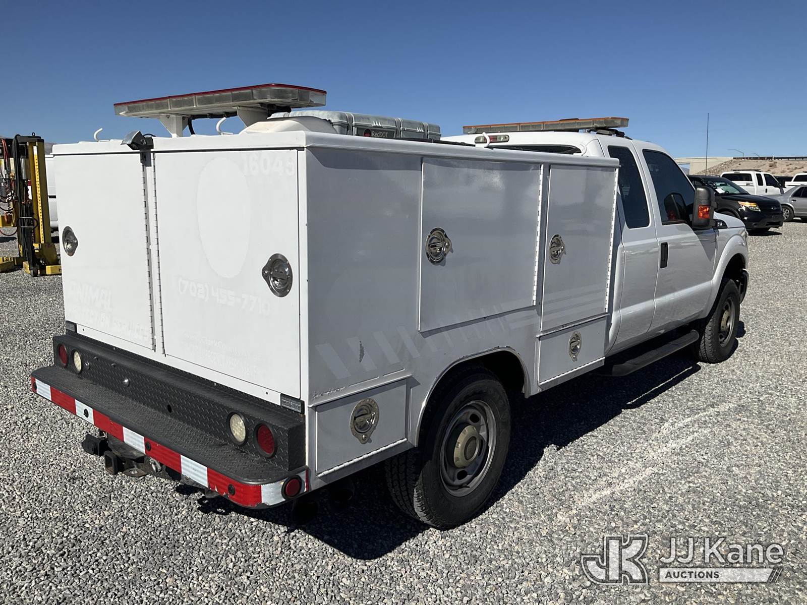 2015 Ford F350 4x4 Extended-Cab Service Truck, 6.7L Auto, diesel, A/C, with animal services bed w/ ac, (124,397 miles) (Runs & Moves) This is a Titled Item NOTE: This unit is being sold AS IS/WHERE IS via Timed Auction and is located in Las Vegas, NV. Inspection & preview days for this unit are the 2 business days prior to the first day of items closing for this auction, item is located at 14655 Grand Valley Pkwy Las Vegas, NV 89165 and hours of operations are 8a-4p. Titles executed exactly as bidder registered. Ensure your name and/or business name and address in JJ Kane and/or ProxiBid is correct before bidding. For pre-sale questions, please contact Office Staff @ (801) 519-0123 and provide sale date and lot number. Las Vegas Dealer License Number DLR000053086 / OHV000053094. (Buyer is responsible for removal. Assistance by consignor or JJ Kane Auctioneers is not assured.)