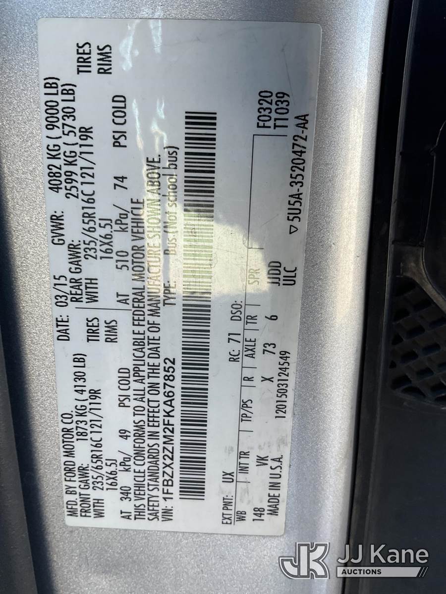 2015 Ford Transit-350 Passenger Van, 3.7L V6 DOHC 24V gas, RWD, 6-Speed Automatic, A/C, (153,989 miles) (Runs & Moves) (Body Damage) (Seller States: AC Blows Hot) This is a Titled Item NOTE: This unit is being sold AS IS/WHERE IS via Timed Auction and is located in Las Vegas, NV. Inspection & preview days for this unit are the 2 business days prior to the first day of items closing for this auction, item is located at 14655 Grand Valley Pkwy Las Vegas, NV 89165 and hours of operations are 8a-4p. Titles executed exactly as bidder registered. Ensure your name and/or business name and address in JJ Kane and/or ProxiBid is correct before bidding. For pre-sale questions, please contact Office Staff @ (801) 519-0123 and provide sale date and lot number. Las Vegas Dealer License Number DLR000053086 / OHV000053094. (Buyer is responsible for removal. Assistance by consignor or JJ Kane Auctions is not assured.)