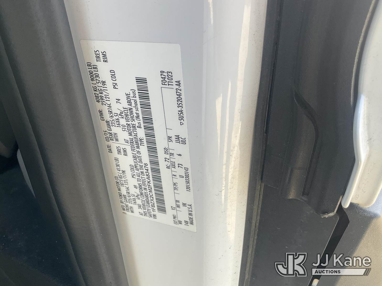 2015 Ford Transit Passenger Van, 6-cyl gas, 6-Speed Automatic, A/C, (22,386 miles) (Runs & Moves ) This is a Titled Item NOTE: This unit is being sold AS IS/WHERE IS via Timed Auction and is located in Dixon, CA. Inspection & preview days for this unit are the 2 business days prior to the first day of items closing for this auction, item is located at 8668 Sparling Ln Dixon, CA 95620 and hours of operations are 8a-4p. For pre-sale questions, please contact JJ Kane Staff at (707) 678-8060 (dixon@jjkane.com). Dealer License Number 45696. (Buyer is responsible for removal. Assistance by consignor or JJ Kane Auctions is not assured.)