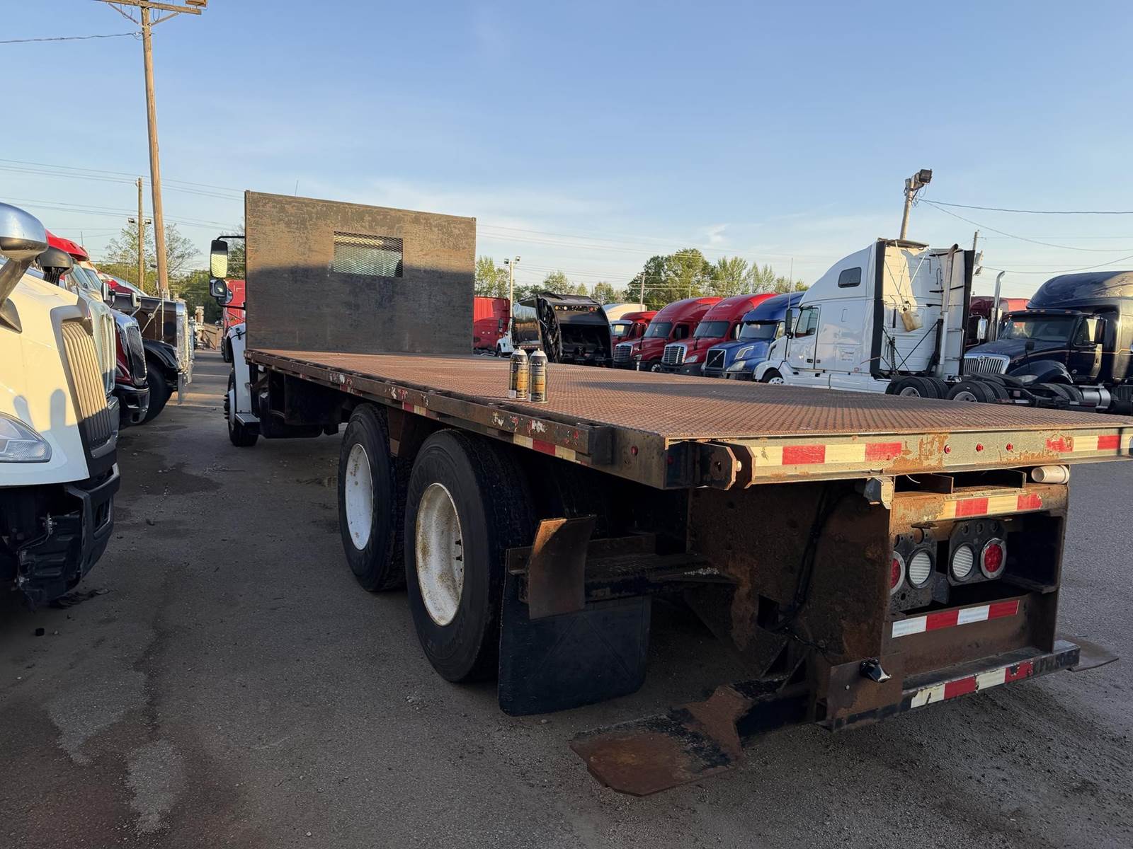 NICE TRUCK, RUNS EXCELLENT, AIR SEAT, AIR BRAKES, STEERABLE AIR LIFT AXLE, FORK LIFT PACKAGE, 24 FT FLAT BED, DIFFERENTIAL LOCK!,