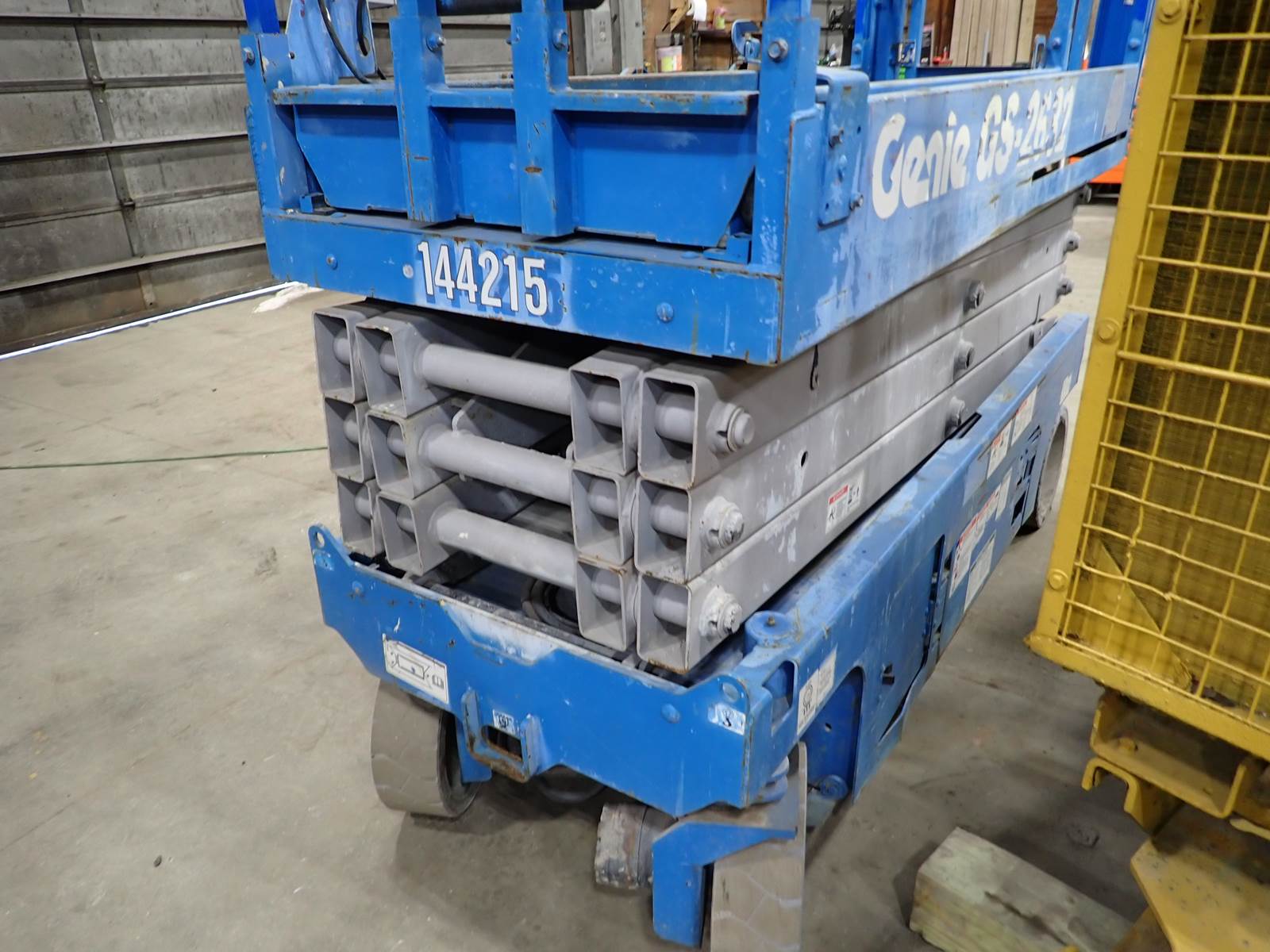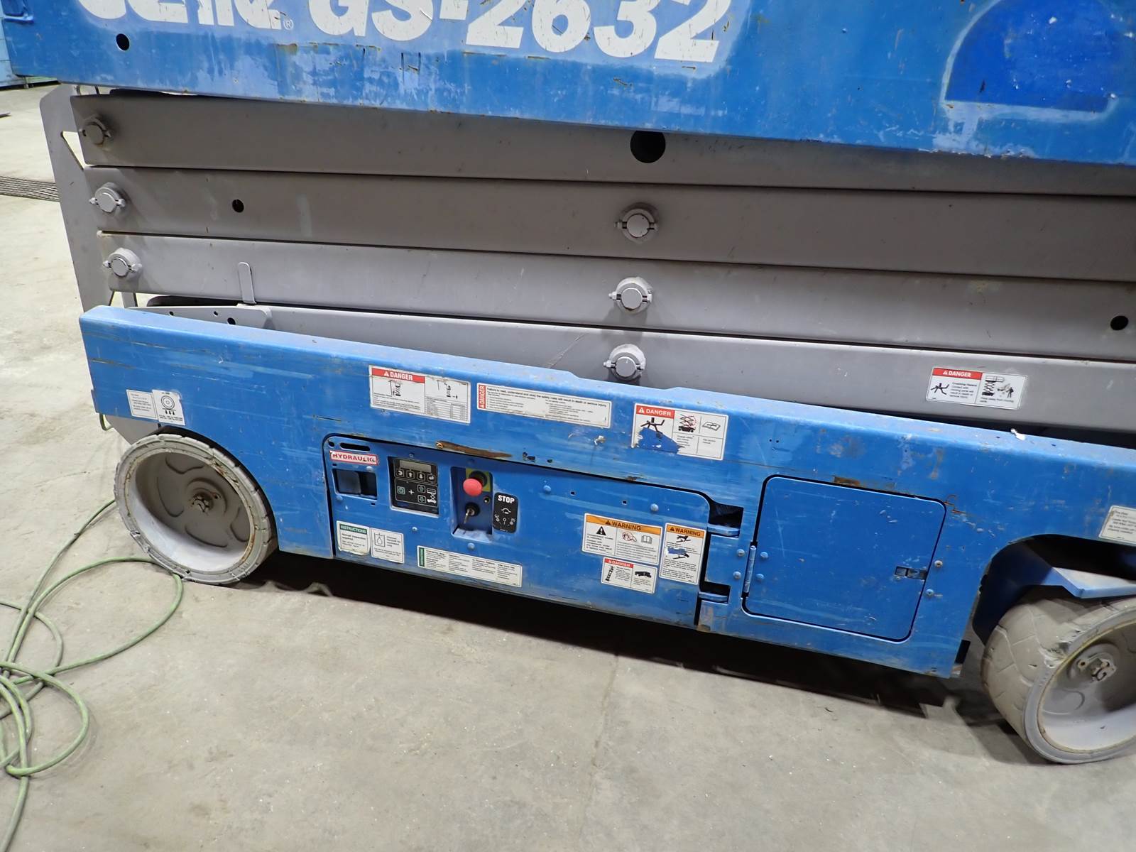2015 Genie GS-2632 aerial lift, slab scissor lift, 500 lbs work load, 4415 lbs operating weight, 26' platform lift height, 32" wide basket, power to platform, electric, upper & low controls, non marking solid tires, 298 hours. NEW BATTERIES JUST INSTALLED -- LIFT IS READY TO GO -- EXCELLENT FOR WAREHOUSE OR PAVED OUTDOOR USES -- NICE CONDITION AND GREAT PRICE !!