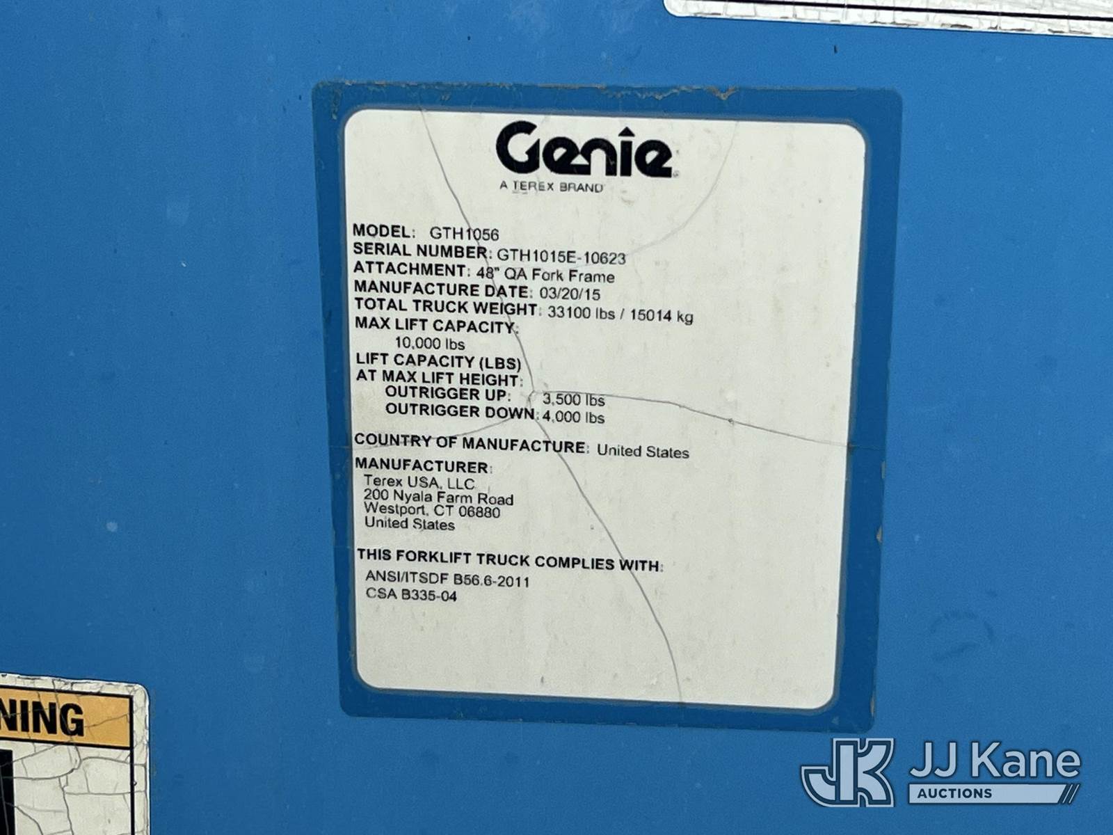 2015 Genie GTH-1056 4x4X4 Rough Terrain Telescopic Forklift, Deutz diesel, powershift, with 10,000 lb capacity, 56 ft reach, 4 stage hyd boom, aux hyd 4 ft mast, 48 in forks & EROPS, (Runs, Moves & Operates) (Reads 2,357 hours) This is a Titled Item NOTE: This unit is being sold AS IS/WHERE IS via Timed Auction and is located in Villa Rica, GA. Inspection & preview days for this unit are the 2 business days prior to the first day of items closing for this auction, item is located at 100 Liberty Rd Villa Rica, GA 30180 and hours of operations are 8a-4p. For more information & removal arrangements please contact Office Staff @ 470-590-8453. (Buyer is responsible for removal. Assistance by consignor or JJ Kane Auctioneers is not assured.)