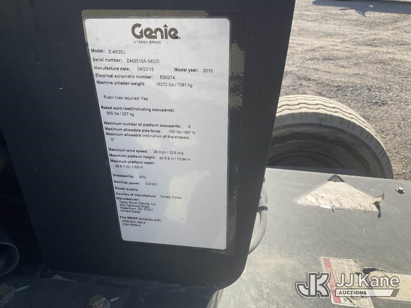 2015 Genie Z45/25J Articulating & Telescopic Manlift, s/n Z452515A-54025, 4wd, battery powered, Hydrostatic, (Runs, Moves & Operates) (Reads 919 hours) NOTE: This unit is being sold AS IS/WHERE IS via Timed Auction and is located in Sparks, NV. Inspection & preview days for this unit are the 2 business days prior to the first day of items closing for this auction, item is located at 601 Britain Dr Sparks, NV 89437 and hours of operations are 8a-4p. Titles executed exactly as bidder registered. Ensure your name and/or business name and address in JJ Kane and/or ProxiBid is correct before bidding. For pre-sale questions, please contact Office Staff @ (801) 519-0123 and provide sale date and lot number. Sparks Dealer License Number DLR000052908 / OHV000052909. (Buyer is responsible for removal. Assistance by consignor or JJ Kane Auctions is not assured.)