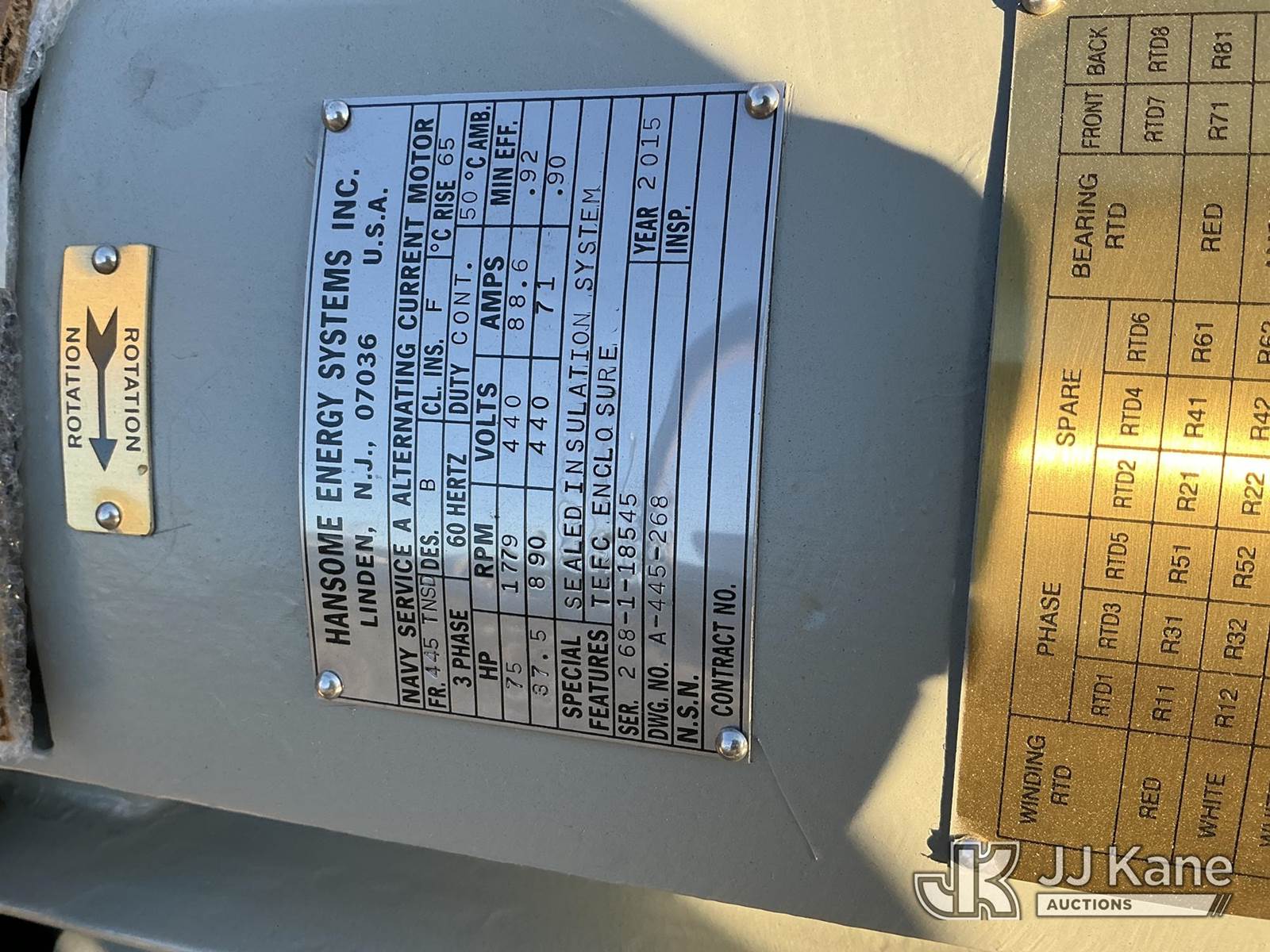 2015 Hansome Energy Systems Alternating Current Motor Model: A-445-268, Per Seller Description: Hansome Energy Systems Alternating Current Motor, Sealed Insulation System, 3 Phase 60 Hertz, Cont. Duty, 75 HP, 1779 RPM, 440 Volts, 88.6 Amps, TEFC Enclosure with pump attached (New/Unused, Condition Unknown) NOTE: This unit is being sold AS IS/WHERE IS via Timed Auction and is located in Thonotosassa, FL. Inspection & preview days for this unit are the 2 business days prior to the first day of items closing for this auction, item is located at 11720 N US 301 Thonotosassa, Fl 33592 and hours of operations are 8a-4p. For pre-sale questions, please contact Office Staff @ (813) 986-2485. (Buyer is responsible for removal. Assistance by consignor or JJ Kane Auctions is not assured.)