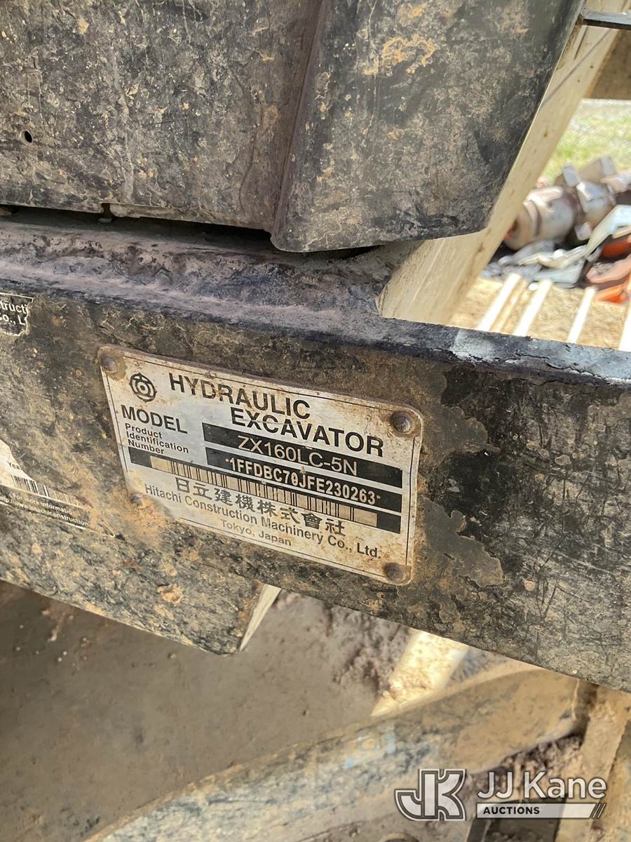 2015 Hitachi ZX160LC-5N Hydraulic Excavator, s/n 1FFDBC70JFE230263, Isuzu Hydraulic Drive, diesel, (Not Running, Partially Disassembled (was running prior to disassembly for diagnosis), Hydraulic Pumps are bad and contaminated the entire system with brass shavings, one boom pin missing, Front Window and Frame missing, hour meter not getting power due to disassembly, hours listed were reported) (Buyer Must Load) (Reads 11,509 hours) NOTE: This unit is being sold AS IS/WHERE IS via Timed Auction and is located in Anderson, CA. For specific technical information about this item; please contact Ryan Pence (ryan.pence@jjkane.com) (Buyer is responsible for removal. Assistance by consignor or JJ Kane Auctioneers is not assured.)