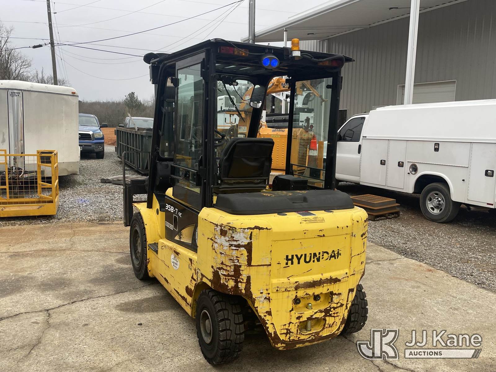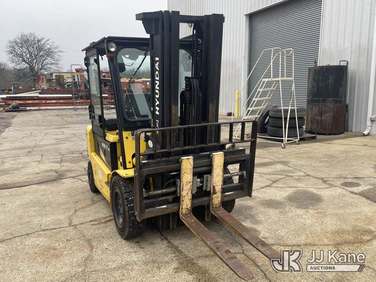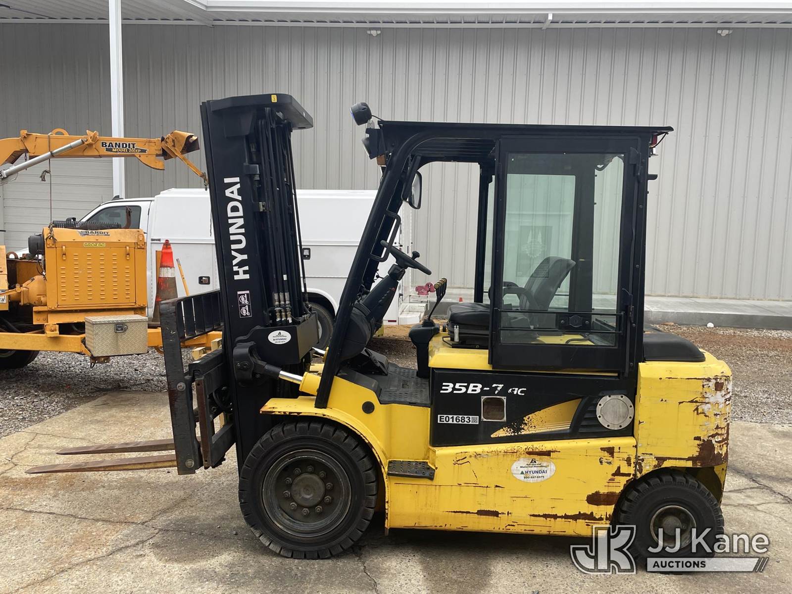 2015 Hyundai 35B-7 Pneumatic Tired Forklift, s/n P33M0560, battery powered, Shuttle, with #6,945lbs capacity, 185 in 3-stage mast, fork positioners, side shift, charger, (Runs, Moves & Operates) (Battery Doesn’t Hold Charge For Long, Comes with Battery Charger Pictured) (Reads 5,311 hours) NOTE: This unit is being sold AS IS/WHERE IS via Timed Auction and is located in Anniston, AL. For more information & removal arrangements please contact Dylan Evans @ 205-936-1094. Alabama Auctioneer Michael Whitebread - License # 5592. (Buyer is responsible for removal. Assistance by consignor or JJ Kane Auctions is not assured.)