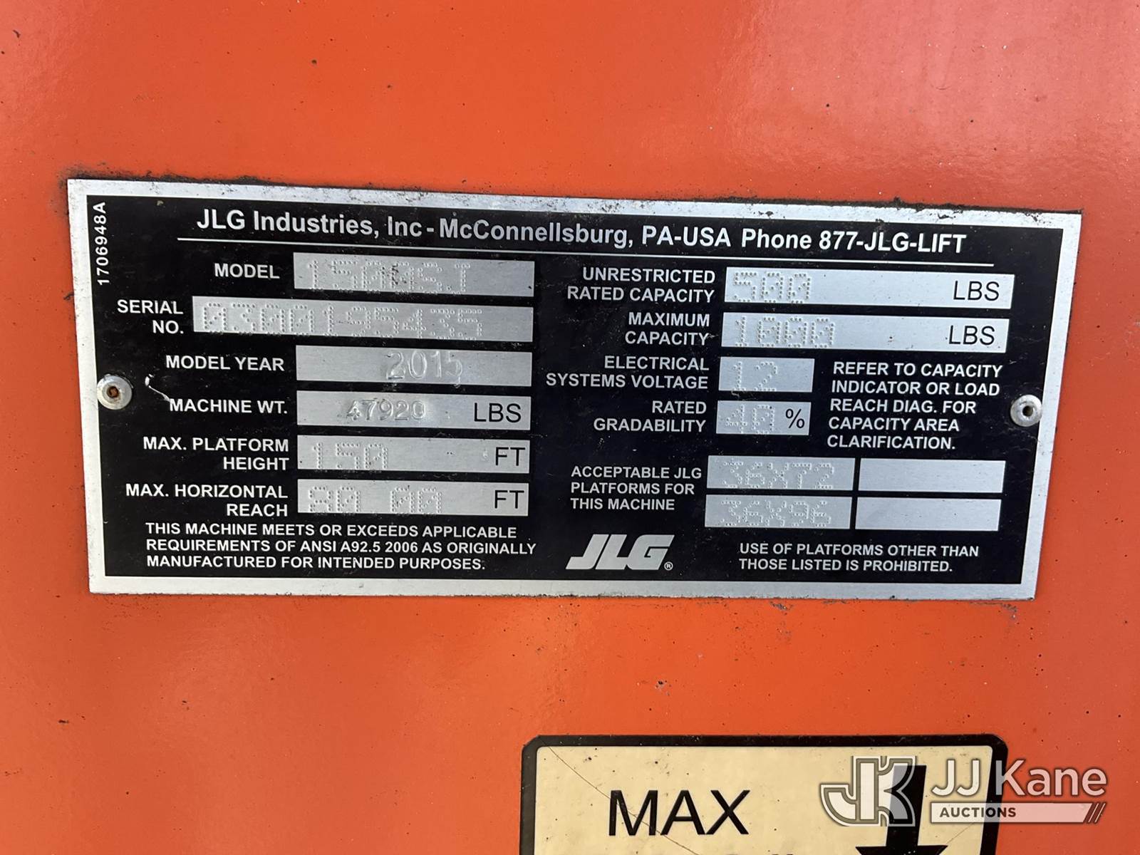 2015 JLG 1500SJ Manlift, s/n 0300195435, Deutz diesel, Hydrostatic, with 150 ft, 4 stage Ultra Boom platform height, Sky Power in basket & Miller CST280 welder w/leads in basket, (Duke Unit) (Runs, Moves & Operates ) (Reads 843 hours) NOTE: This unit is being sold AS IS/WHERE IS via Timed Auction and is located in China Grove, NC. Inspection & preview days for this unit are the 2 business days prior to the first day of items closing for this auction, item is located at 820 E NC Hwy 152 China Grove, NC 28023 and hours of operations are 8a-4p. For pre-sale questions, please contact Office Staff @ (704) 674-1113. (Buyer is responsible for removal. Assistance by consignor or JJ Kane Auctions is not assured.)
