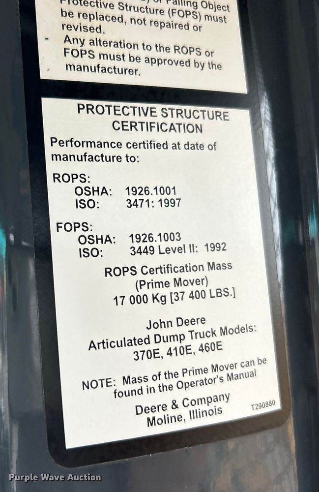 2015 John Deere 410E articulated haul truck, Hours: 12,492 on meter, Serial: 1DW410ETKEE665452, Engine, John Deere, Displacement: 13.5L,...