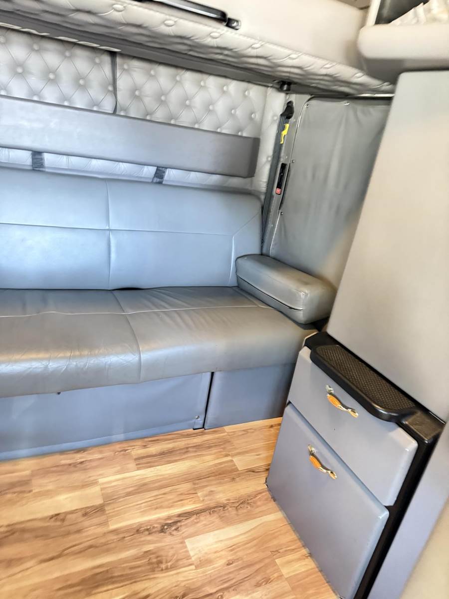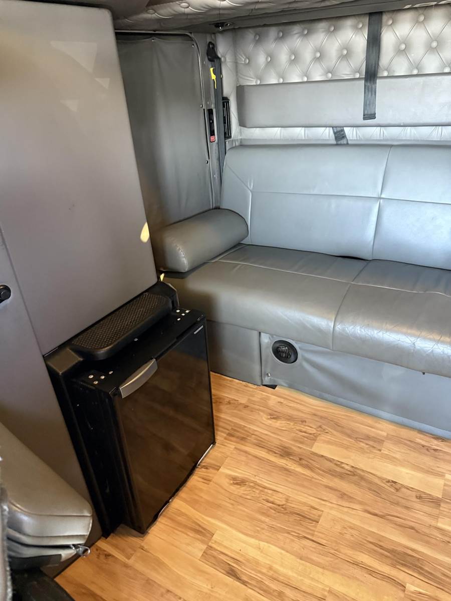 Studio sleeper: couch, upper bunk, fridge, wood floors, custom dash