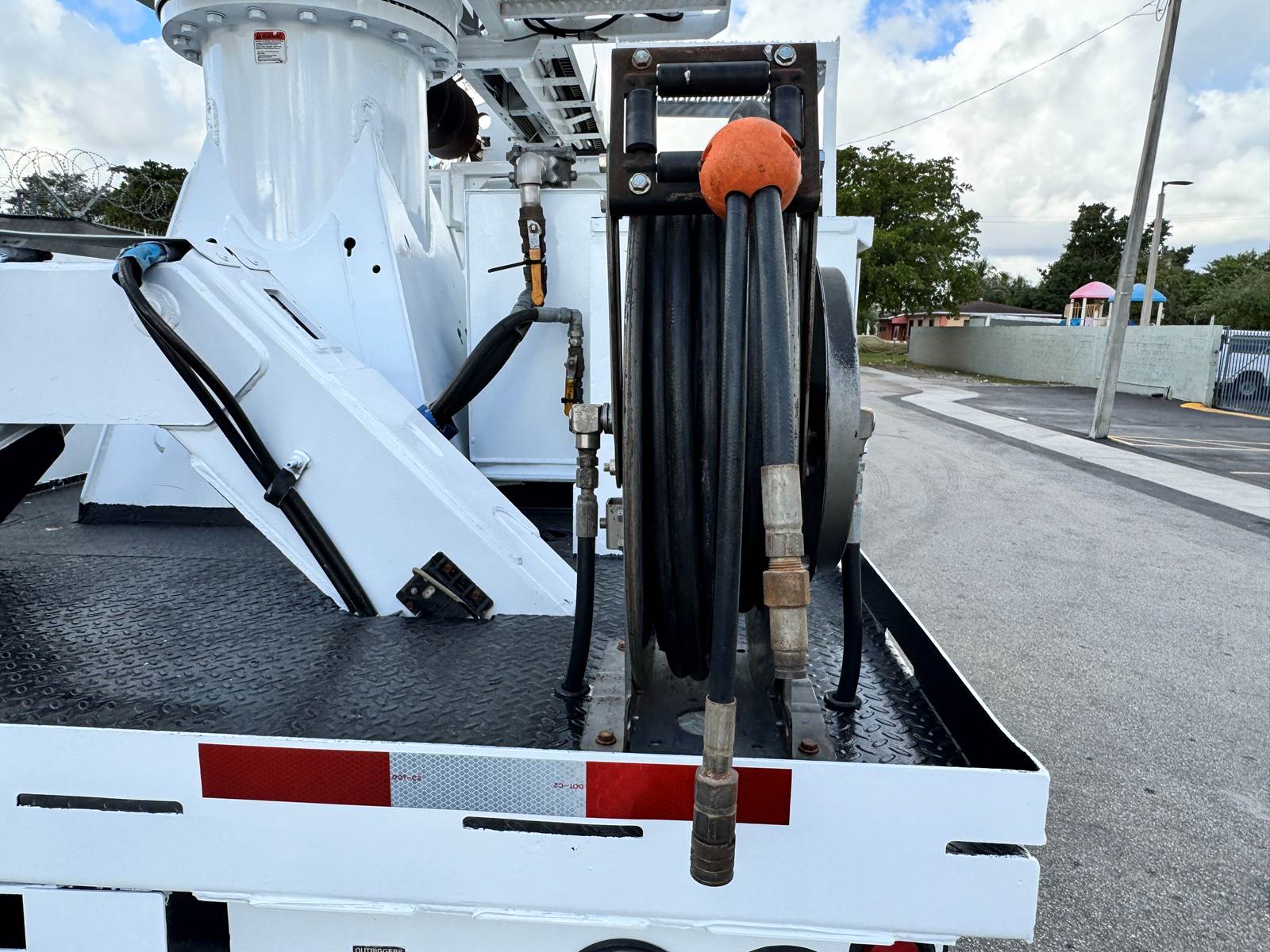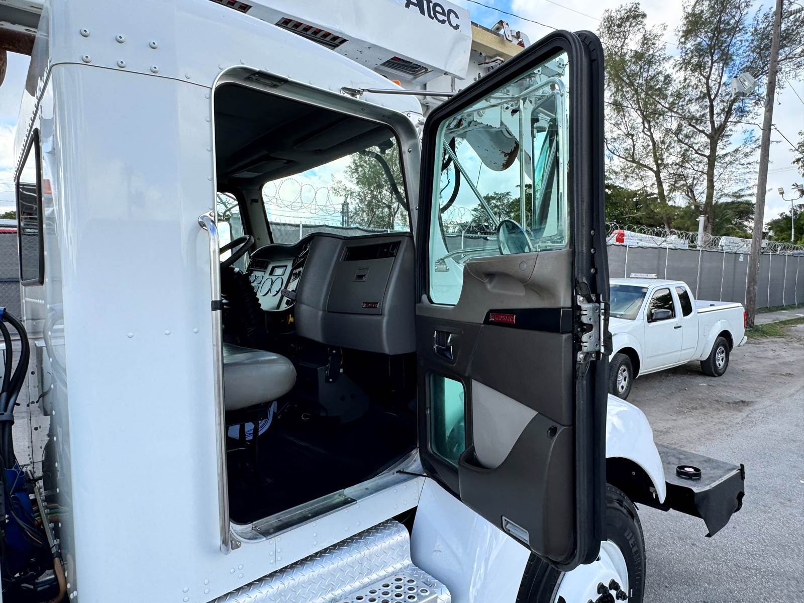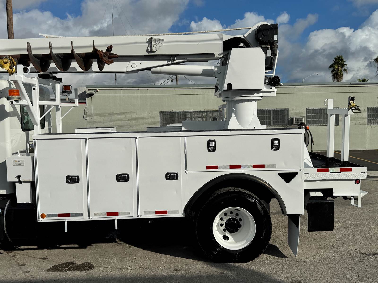 The Altec DM47B features a 47-foot sheave height and 37.3-foot horizontal reach, supported by a three-section hydraulic telescopic boom. Built for precision and power, it includes an 18-inch auger, hydraulic pole grabs, a 2-speed digger drive, and continuous rotation capability. The boom offers Category C (46kV) insulation for safe electrical utility work and includes hydraulic side-load protection, heel winch, and an Altec Opti-View control seat for enhanced visibility and operator control.