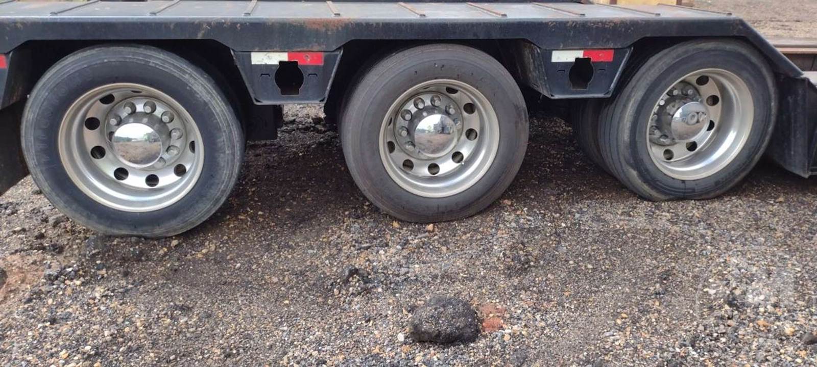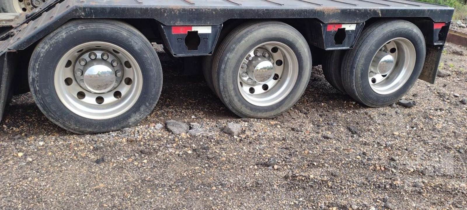 HYDRAULIC RGN LOWBOY TRAILER, TRI-AXLE, GAS POWER PACK, OUTRIGGERS, COVERED WHEELS, DECK LENGTH 26', 8'6" WIDE, AIR RIDE SUSPENSION, WOOD DECKING, ALUMINUM OUTSIDE DISC WHEELS, 255/70R22.5 TIRES