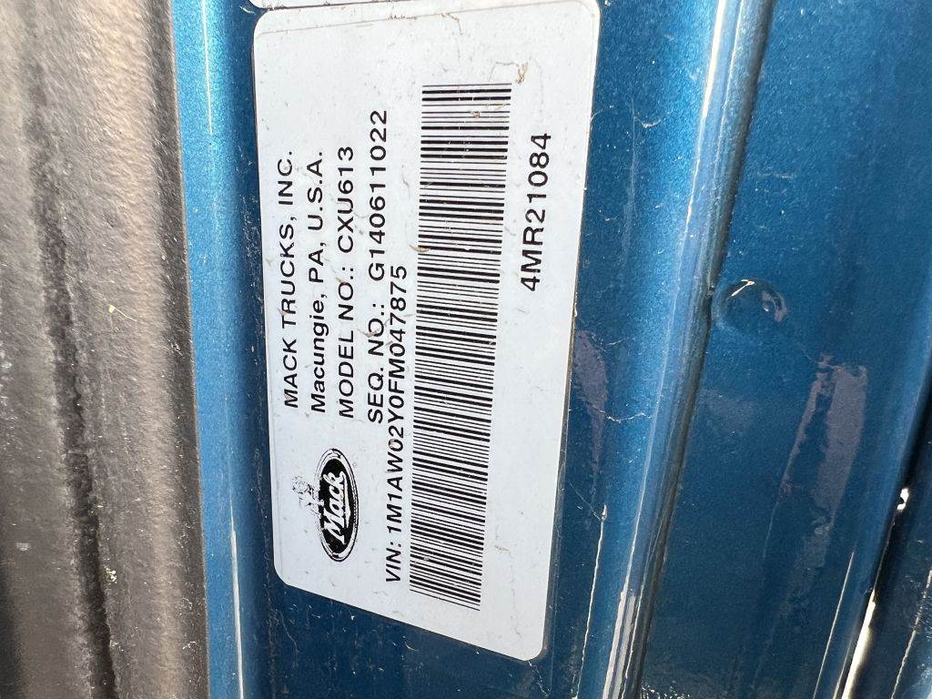 Location: Washougal WA ***End-User Consignment*** VIN: 1M1AW02Y0FM047875 Engine: Mack MP7 10.8L Diesel Transmission: Automatic Stationary 5th wheel, lift axle, Right Weigh load scale, ProTech chain hangers, trailer air supply, air brakes, power/heated mirrors, 29,985 engine hours, cruise control, PTO, engine brake, diff lock, A/C, AM/FM/CD, CB radio, air bag suspension, 285/75R24.5 front tires, 255/70R22.5 lift tires, 285/75R24.5 rear tires. Miles: 949,005