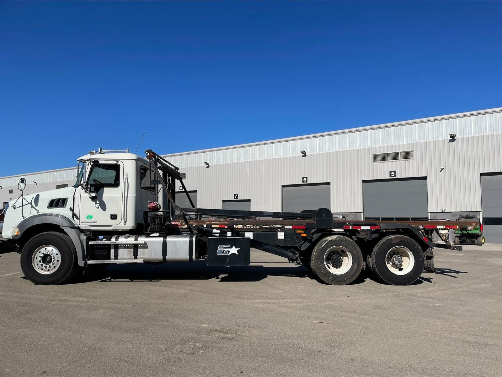 Tandem, 60,000 # Galbreath Roll-Off, Hydraulic Tarp, MP7 Mack 365 HP, Allison Automatic 6 Speed, 4.50 Ratio, 2 Stage Engine Brake, Camelback, Double Frame, 20K FA, 44K RA, 260" WB, 23'10" Bridge, Diff Lock, P/S, A/C, AM/FM CD Bluetooth, Heated Mirrors, Cruise, Tilt/Tele Wheel, Power Passenger Window, 125 Gallon Aluminum Fuel Tank, 425/65R22.5 Steer Tires on Aluminum Wheels, 11R22.5 Drive Tires on Steel Wheels, Chrome Bumper