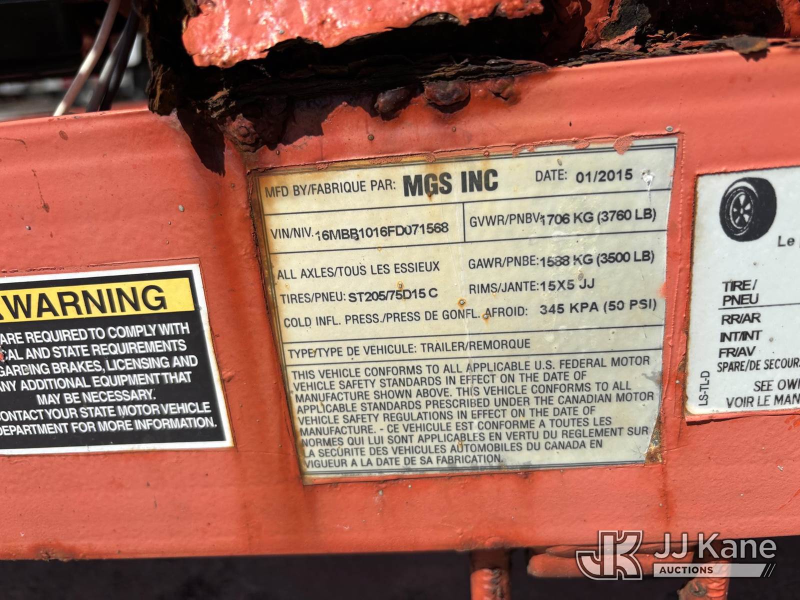 2015 MGS S/A Pump Trailer, s/n 16MBB1016FD071568, 4.4L diesel, (No Title) (Not Running, Condition Unknown) (Rust, Body & Paint Damage) NOTE: This unit is being sold AS IS/WHERE IS via Timed Auction and is located in Riviera Beach, FL. An inspection day for FPL auction items will be conducted on the Friday before the auction from 8a-3p at 2455 Port West Boulevard, Riviera Beach, FL 33407. Winning Buyer/Hauler must present copy of paid invoice upon arrival to pick up. For load out and pick up information, please reference the release form sent out after purchase. Any more information please call Andy Garcia @ 561-215-0085. (Buyer is responsible for removal. Assistance by consignor or JJ Kane Auctions is not assured.)