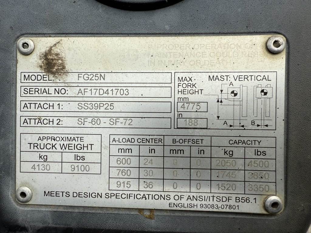Location: Washougal WA ***Rental Industry Consignment*** S/N: AF17D41703 Engine: 2.1L 4cyl Gas/LPG Transmission: Powershift 42" Forks, 3 stage mast, 4,500lb capacity, 188" reach, 6 degree back tilt, EROPS, beacon light, work lights, 7.00-12 non-marking front tires, 6.00-9 non-marking rear tires.