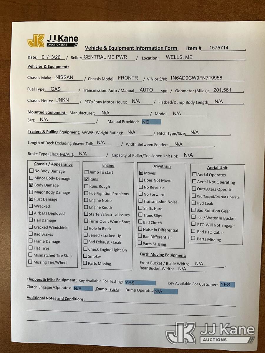 2015 Nissan Frontier 4x4 Extended-Cab Pickup Truck, 4.0L V6 DOHC 24V Gas, Auto, A/C, with bed cover, (201,561 miles) (Runs & Moves) (Body/Rust Damage) (Removal is by Appointment Only, Buyer MUST make a appointment prior to picking up, Buyer/Transporter Must have PAID IN FULL RELEASE. No onsite assistance available, Please Come prepared.) This is a Titled Item NOTE: This unit is being sold AS IS/WHERE IS via Timed Auction and is located in Wells, ME. Inspection & preview days for this unit are by appointment only; please contact us at contact@jjkane.com or 84-Go-JJKane for more details. (Buyer is responsible for removal. Assistance by consignor or JJ Kane Auctions is not assured.)