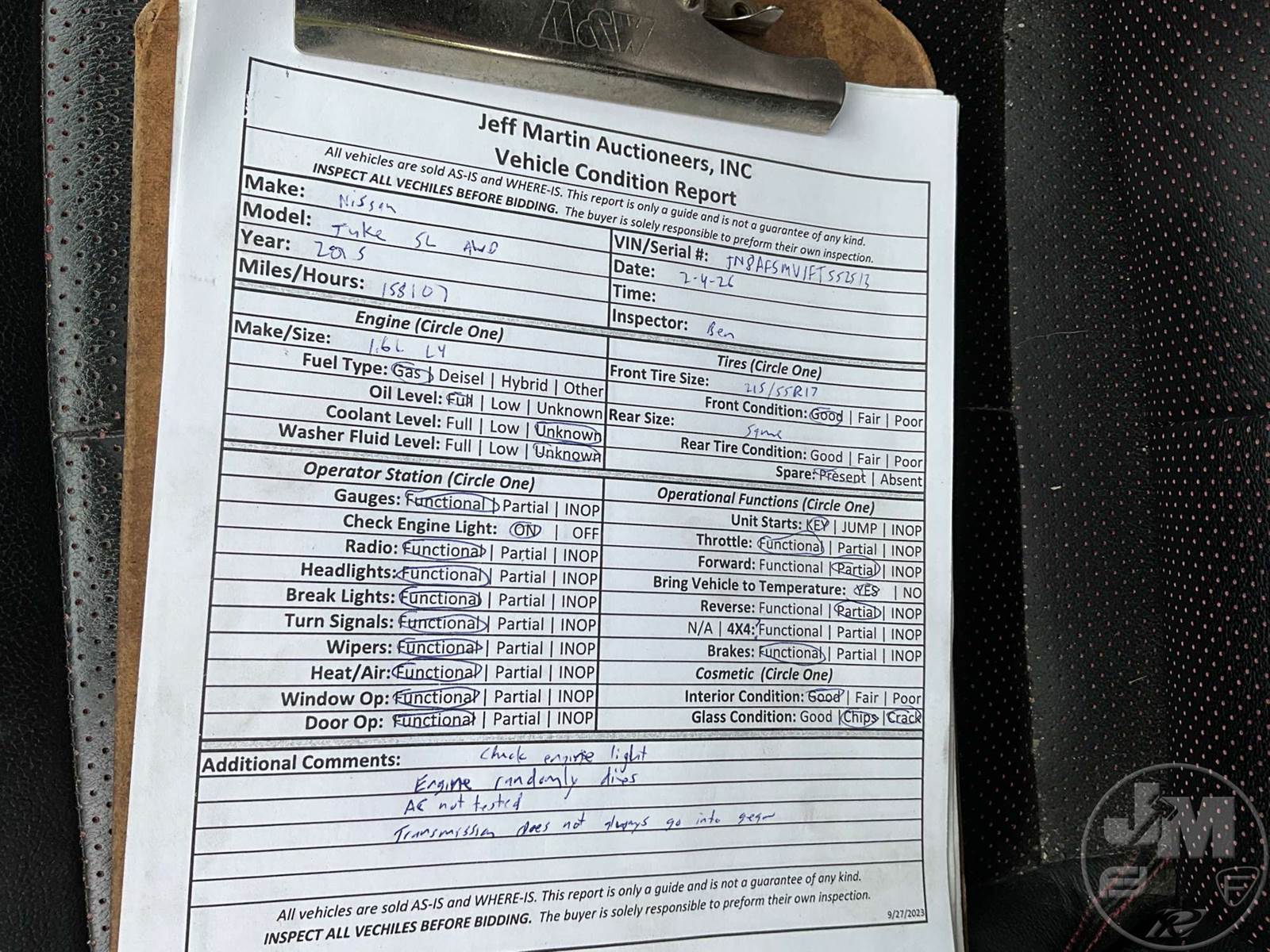 AWD, 4 CYL, GAS ENGINE, AUTOMATIC TRANSMISSION, VINYL, CRUISE, NAV SYS, SAT RADIO, HEATED SEATS, REAR VIEW CAMERA, SUNROOF, POWER WINDOWS, POWER LOCKS, YELLOW, ODOMETER READS: 158107, ***ENGINE RANDOMLY STALLS, TRANSMISSION ISSUES, WILL NOT ALWAYS GO INTO GEAR, WINDSHIELD CRACKED, SERVICE ENGINE SOON LIGHT***