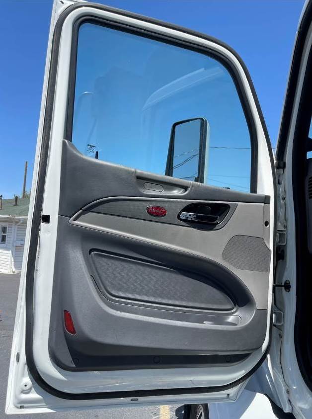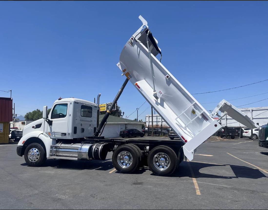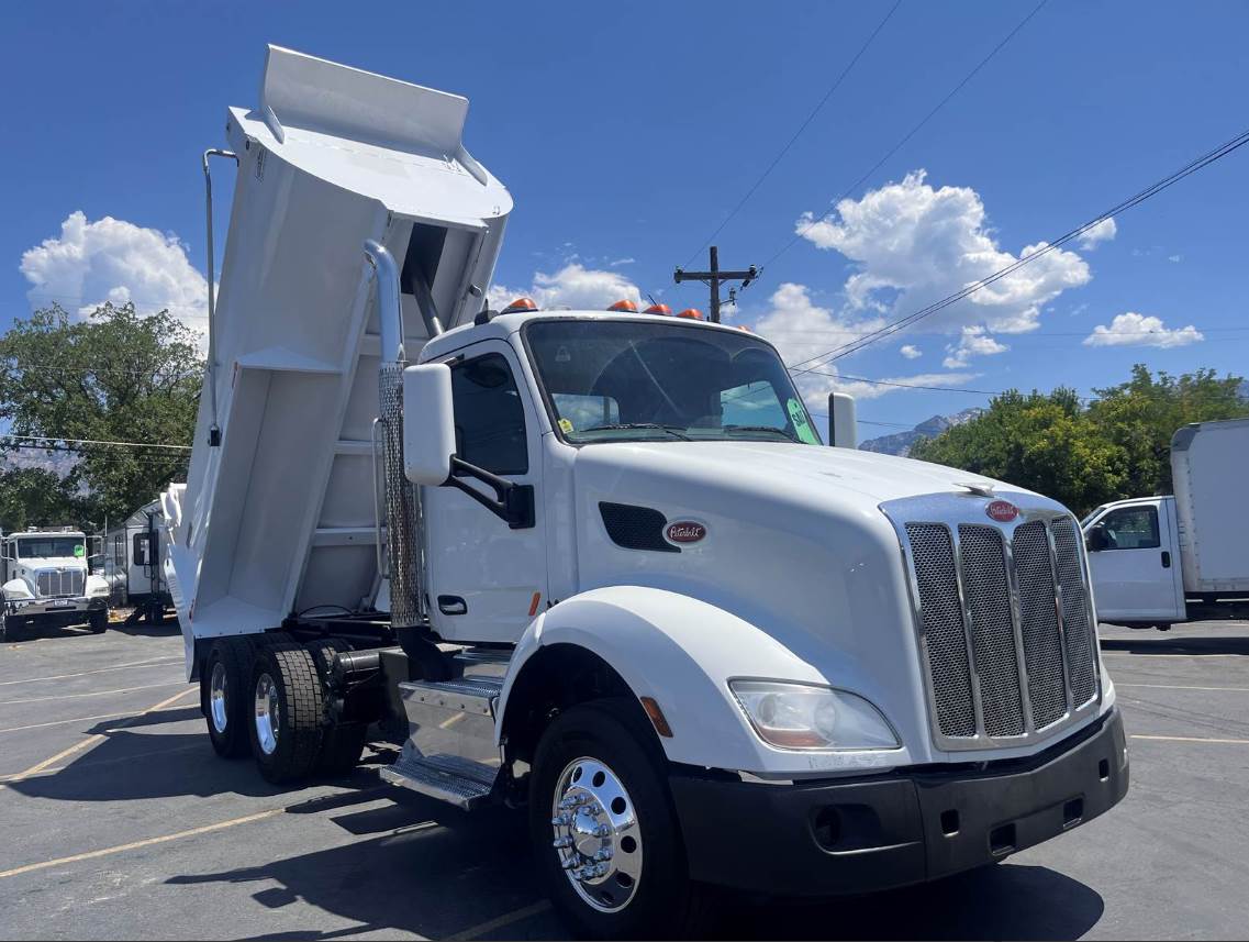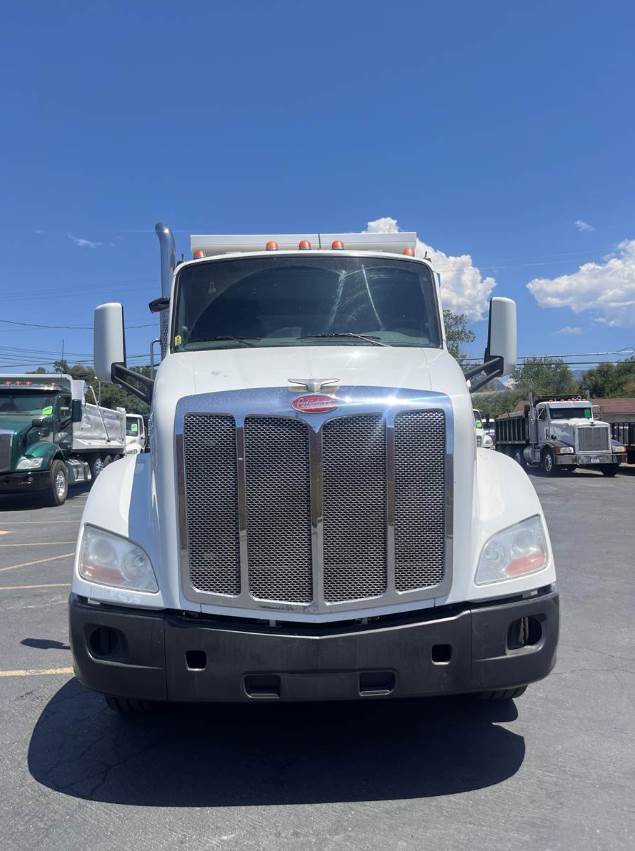 This is a 2015 Peterbilt 579, Tandem truck with a New 15' Dump Body, MX-13 -12.9 Ltr, Engine, 10-Speed Manual Transmission, Full Air-brakes, Jake Brake, Leaf-Air Suspension, 455+ H.P., Aluminum Fuel Tanks, (1) Stainless Steel Stack, Chrome Grill, Aluminum Steps, Power Steering, Air-ride seat w/ arm rests, Comfortable fixed passenger seat, Power Windows/Locks/Mirrors, AM/FM/CD/Aux radio w/ Speakers, Cup holders, A/C and Heat, Tinted Glass, Dump body Controls in the Cab, DEF/DPF, Inner Axle Locks, W.B. 191", Battery Box System, Large painted mirrors, Site Mirrors and Rear window, Stainless Steel Sun Visor (not shown), Polished Aluminum Wheels, Front axle 12,000 lbs. (315/80RX22.5)  Rear Axle rating 40,000 lbs. (295/75R22.5) - Wheels: 10 holes 22.5 (Steel disc). C.Y. 14.34