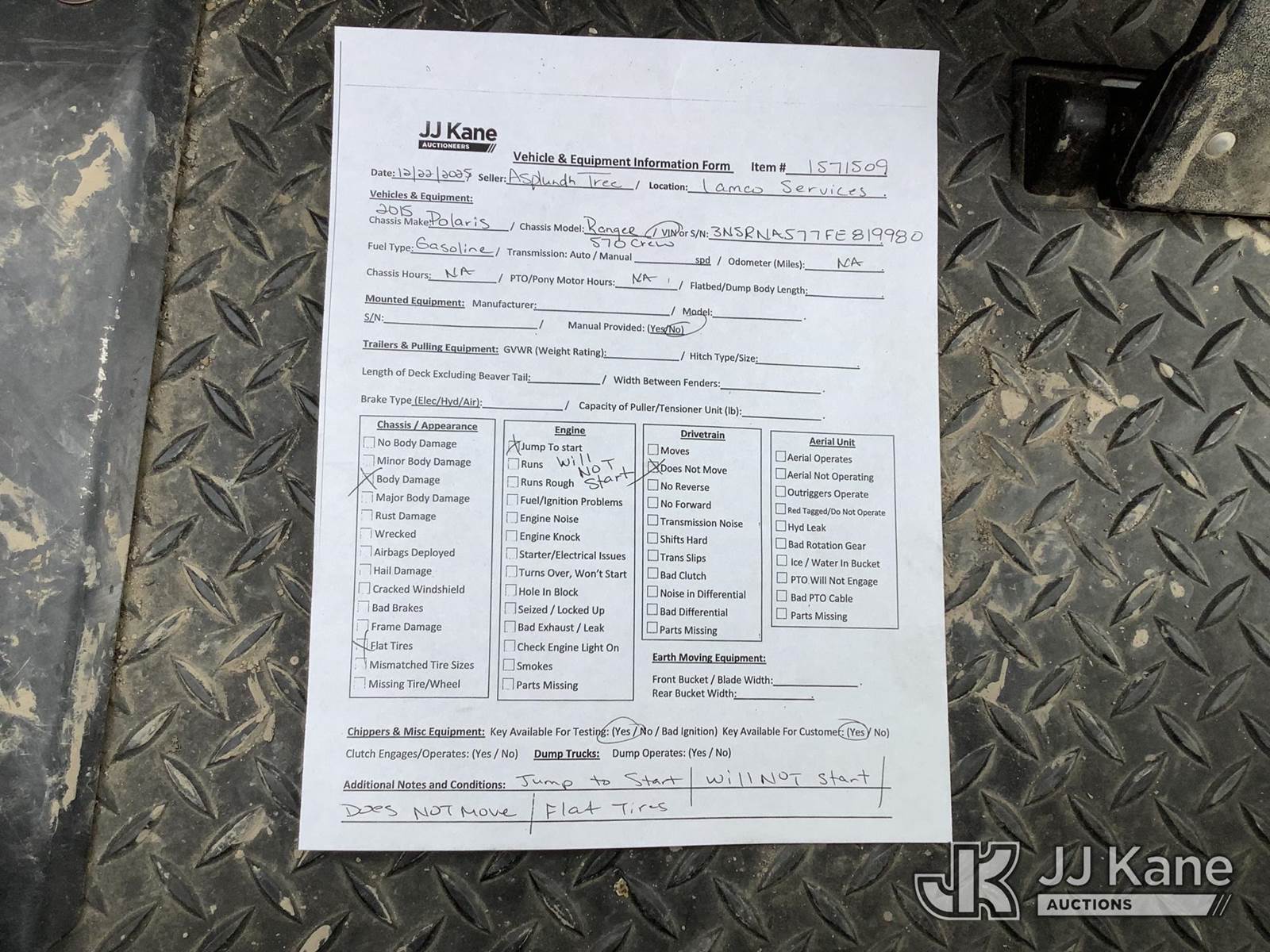 2015 Polaris Ranger 570 Crew All-Terrain Vehicle, s/n 3NSRNA577FE819980, Auto, gas, (Not Running, Condition Unknown, Would Not Jump Start, Flat Tires, Body Damage) NOTE: This unit is being sold AS IS/WHERE IS via Timed Auction and is located in Graysville, AL. Inspection & preview days for this unit are by appointment only; please contact us at contact@jjkane.com or 84-Go-JJKane for more details. Alabama Auctioneer Michael Whitebread - License # 5592 (Buyer is responsible for removal. Assistance by consignor or JJ Kane Auctions is not assured.)
