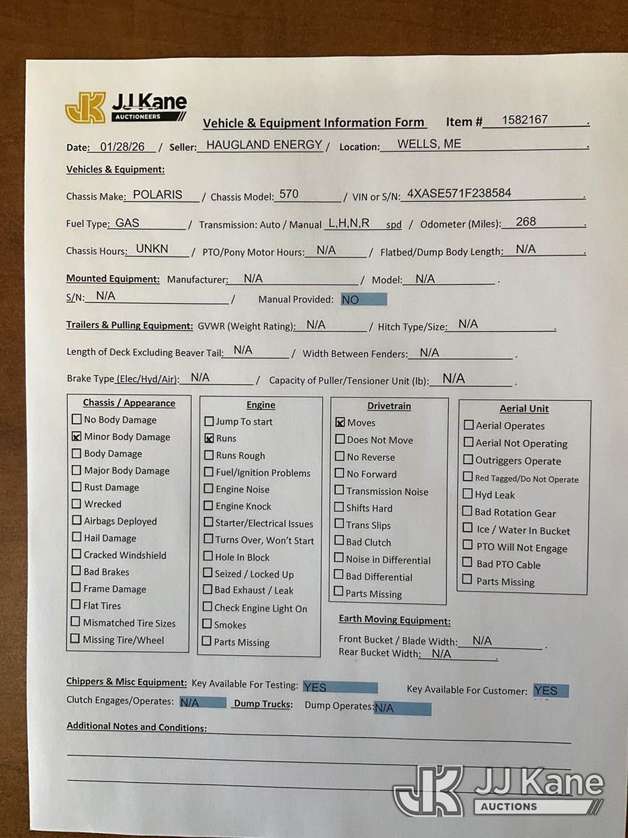 2015 Polaris Sportsman 570 AWD 4-Wheeler, s/n 4XASE571F238584, gas (268 miles) (No Title) (Runs & Moves) NOTE: This unit is being sold AS IS/WHERE IS via Timed Auction and is located in Wells, ME. Inspection & preview days for this unit are by appointment only; please contact us at contact@jjkane.com or 84-Go-JJKane for more details. (Buyer is responsible for removal. Assistance by consignor or JJ Kane Auctions is not assured.)